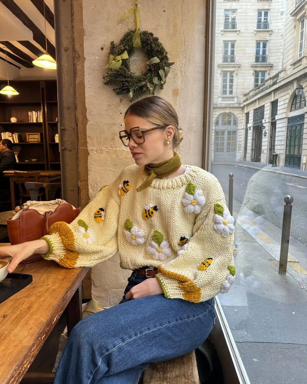 三角巾不是很長的話,還可以把三角巾“尾巴”藏進毛衣裏,對於一些容易老氣的圓領毛衣,它可以改造下脖頸設計,增加亮點。