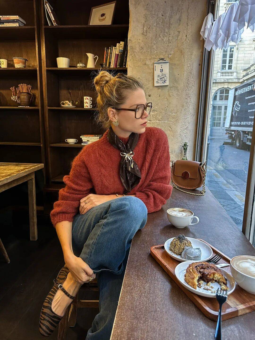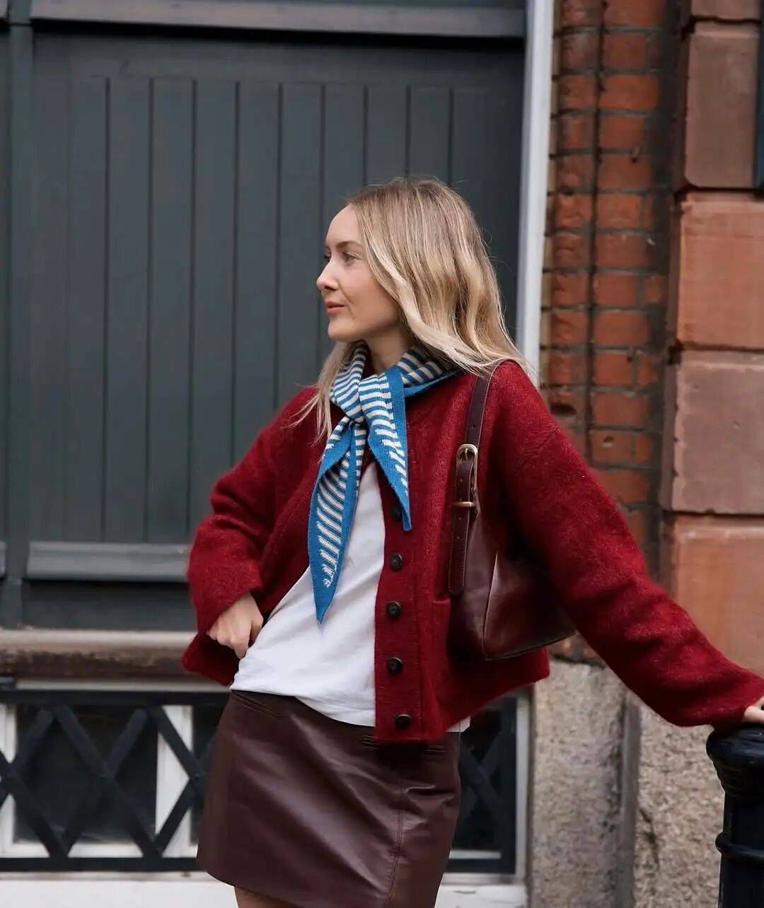 棕色毛衣/外套+紅色三角巾,也是不出錯的經典配色組合。▼