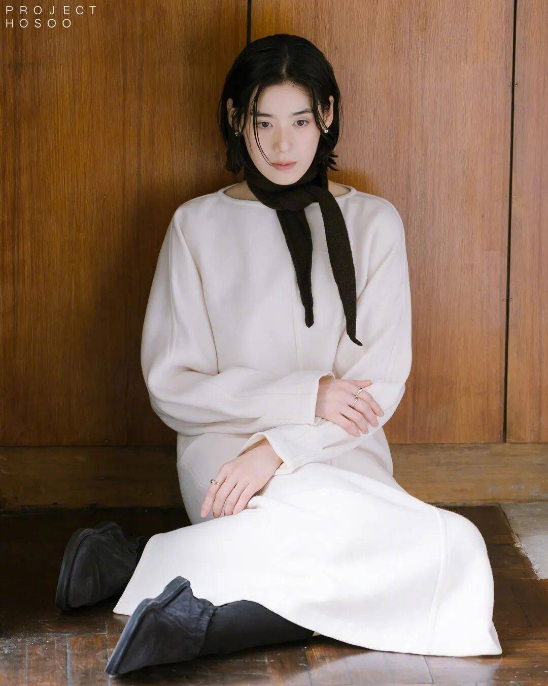 最簡單也是最常見的,就是在脖子上繞一圈打個結,保暖性能最佳~鄭恩彩給EYES Magazine拍的造型就是這麽用三角巾的。