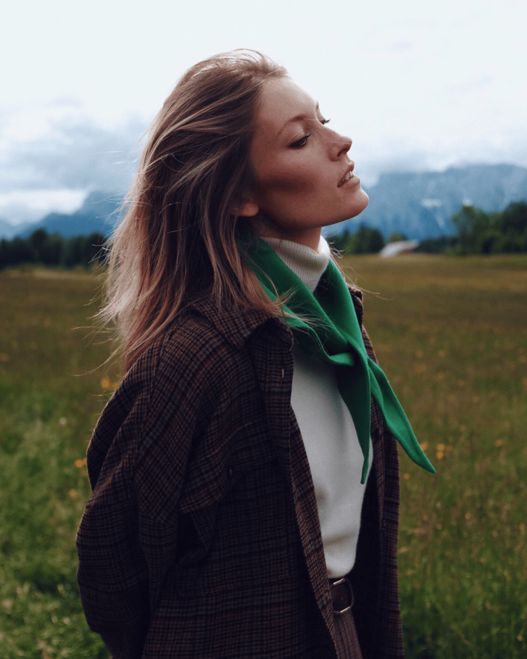 一點點綠加在脖子上,也顯得很有生機,可以成為各種深色外套的“救星”~