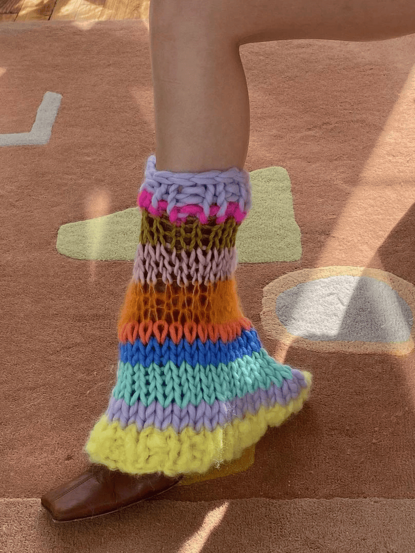 擇喇叭款襪套,和喇叭褲有同樣的效果,將膝蓋處的位置收緊再順著小腿延伸開,悄無聲息地就遮住了小腿