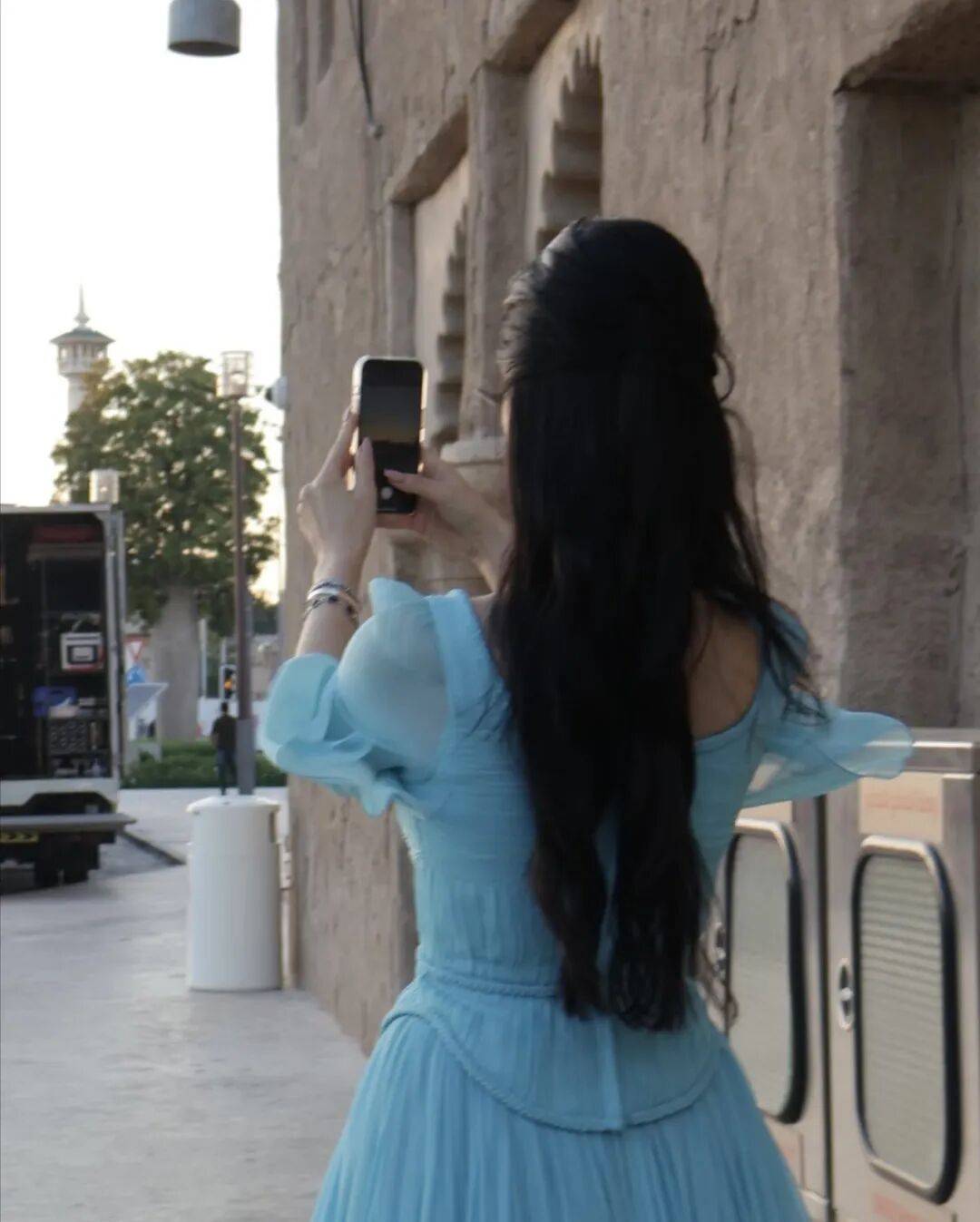 這一條印花裙絕美,尤其搭配半紮發盤發,還插了一支簪子,古典小清新,特別能凸顯東亞女性的美。