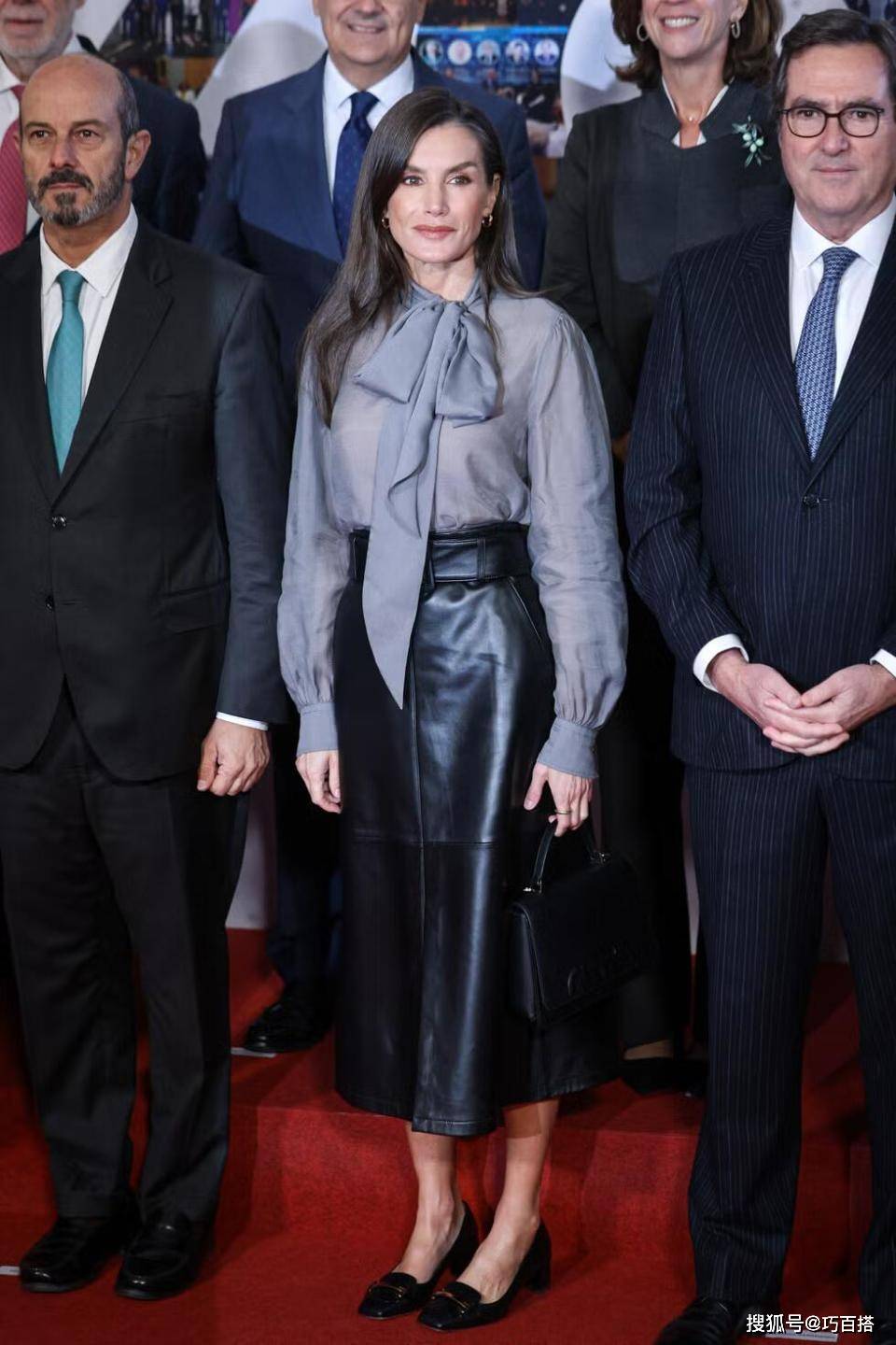目前處於“深秋季節”的西班牙溫度讓西班牙王後的穿搭有較大的可塑性,白天平均溫度12度以上的時候,西班牙王後選擇了一件淺灰色薄紗飄帶襯衫,搭配黑色高腰皮裙,精致利落又有女人味,不呆板但也不張揚。