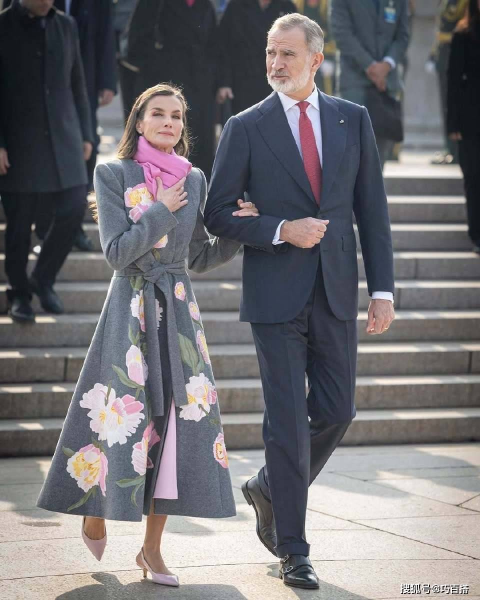 選擇灰色牡丹印花大衣時,萊蒂齊亞選擇內搭粉色連衣裙,與粉色低跟鞋搭配,和諧統一又不突兀,又美又俏,一點不像53歲的人,狀態保持真棒。