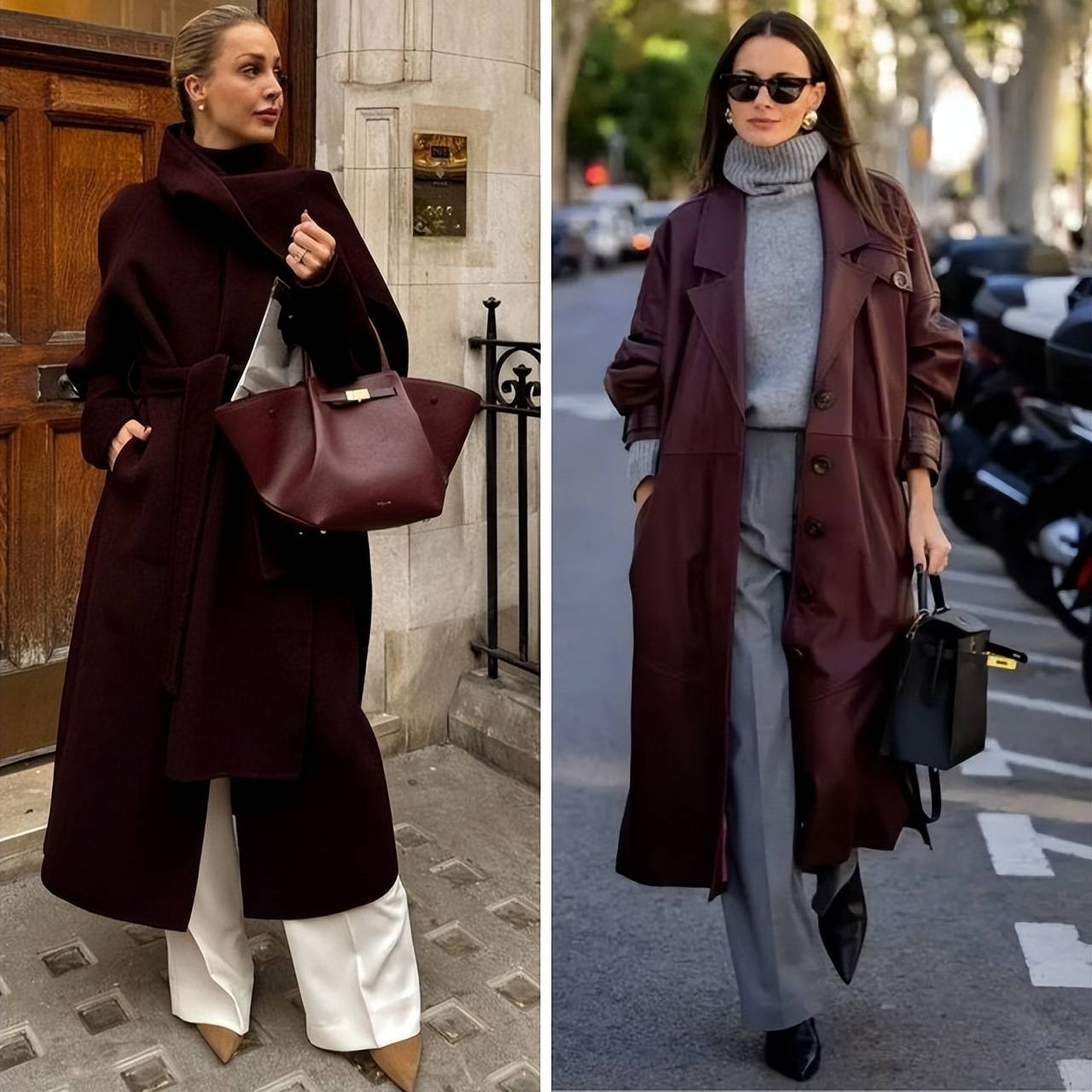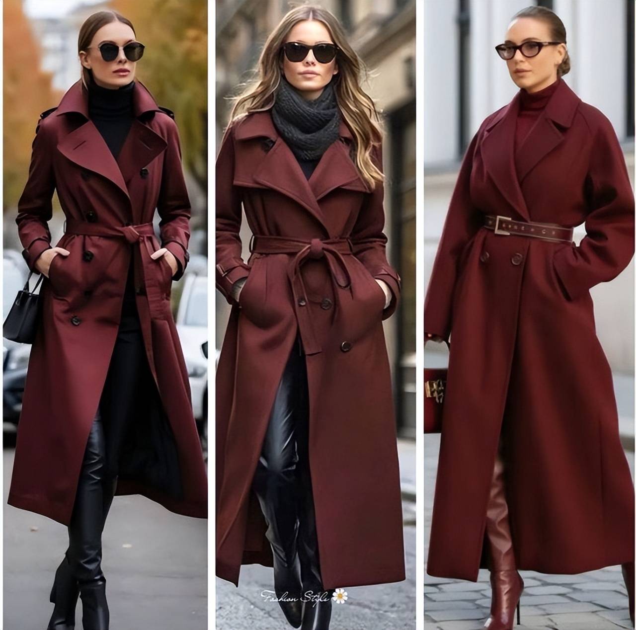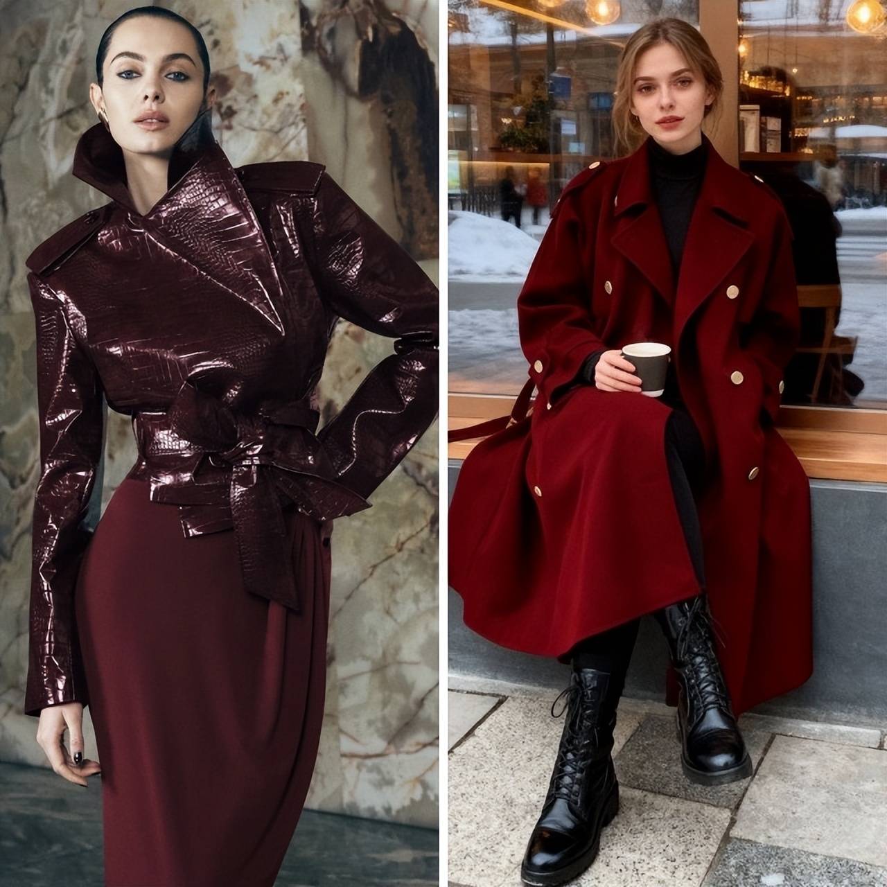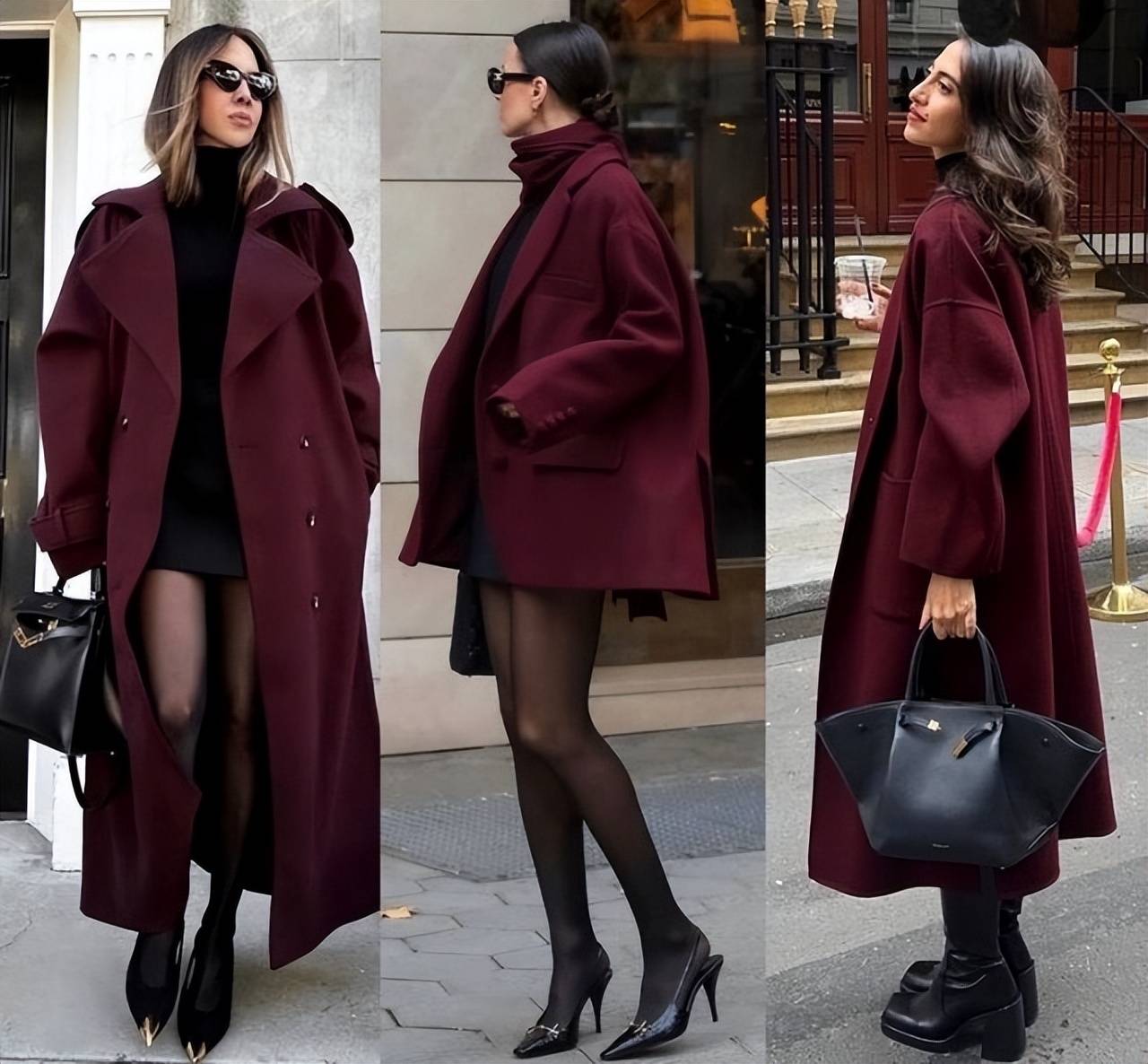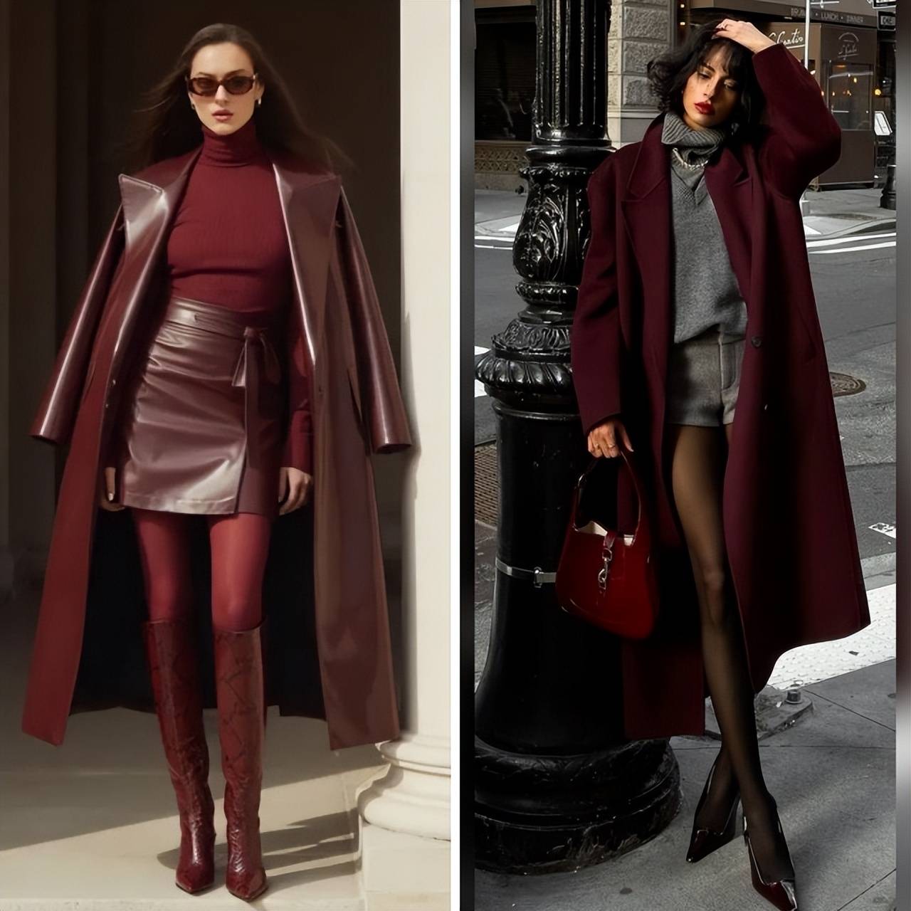 在冬季,勃艮第紅尤其受歡迎,常出現在外套、毛衣、圍巾、裙子等單品上。它與秋冬季節的冷冽氛圍非常契合,能夠為整體造型增添溫暖感和層次感。