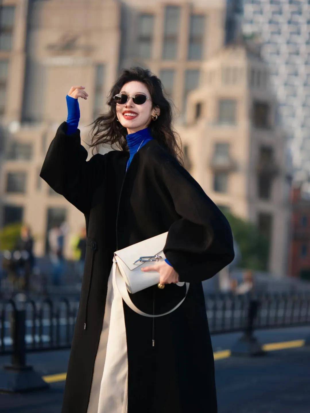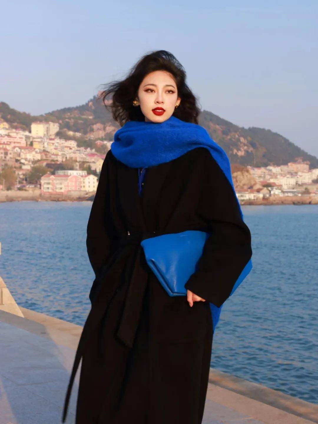我們可以選擇黑色大衣內搭一件克萊因藍的毛衣,再搭配一條修身的白色色褲子或者長裙,這樣既能突出藍色的獨特魅力,又能借助黑色的沉穩來平衡整體色調。