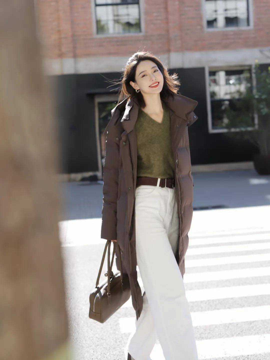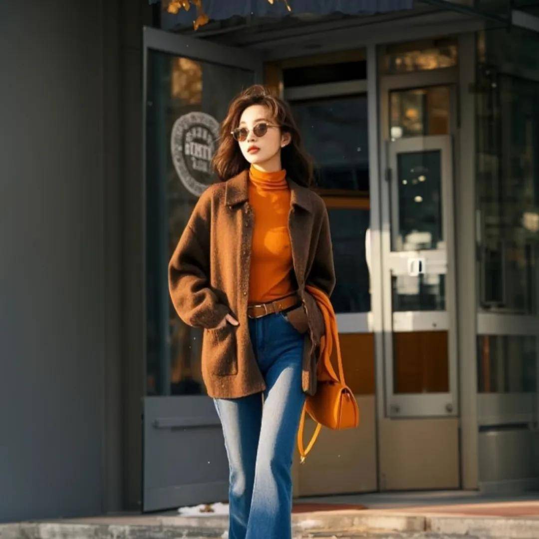 或者直接搭配一件橙黃色的內搭,這種跳躍感被沉穩的咖色中和,既打破了冬日的沉悶,又不會顯得過於張揚。