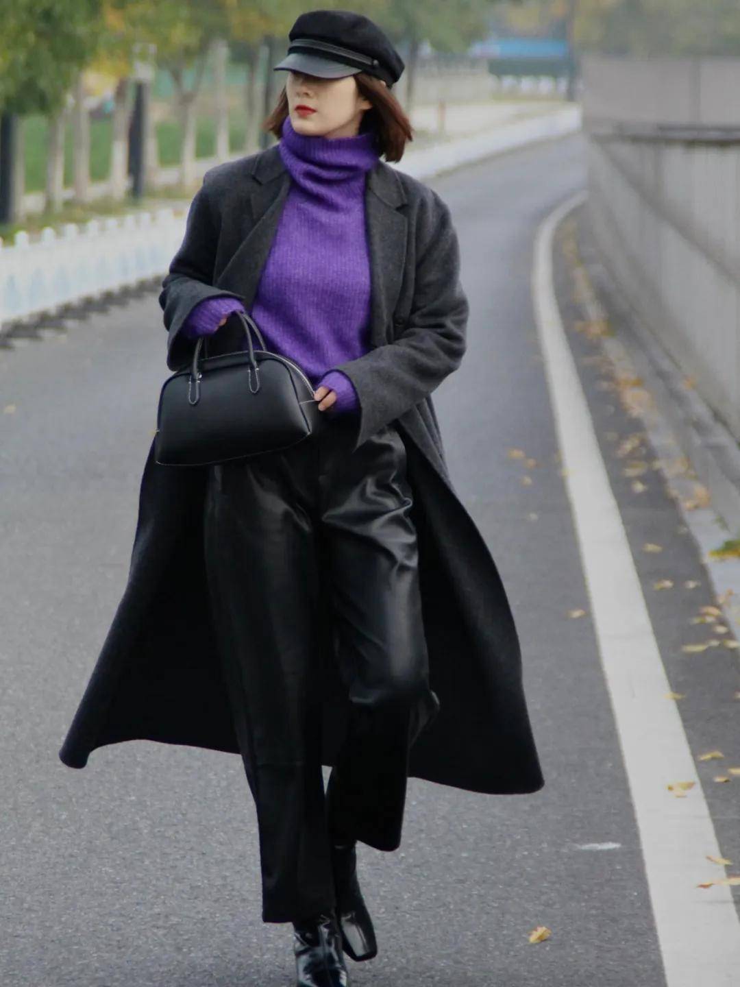 或者用五五分的配色方式,薰衣草紫的毛衣搭配灰色的長褲,讓這份深沉增添一份靈動與柔和。