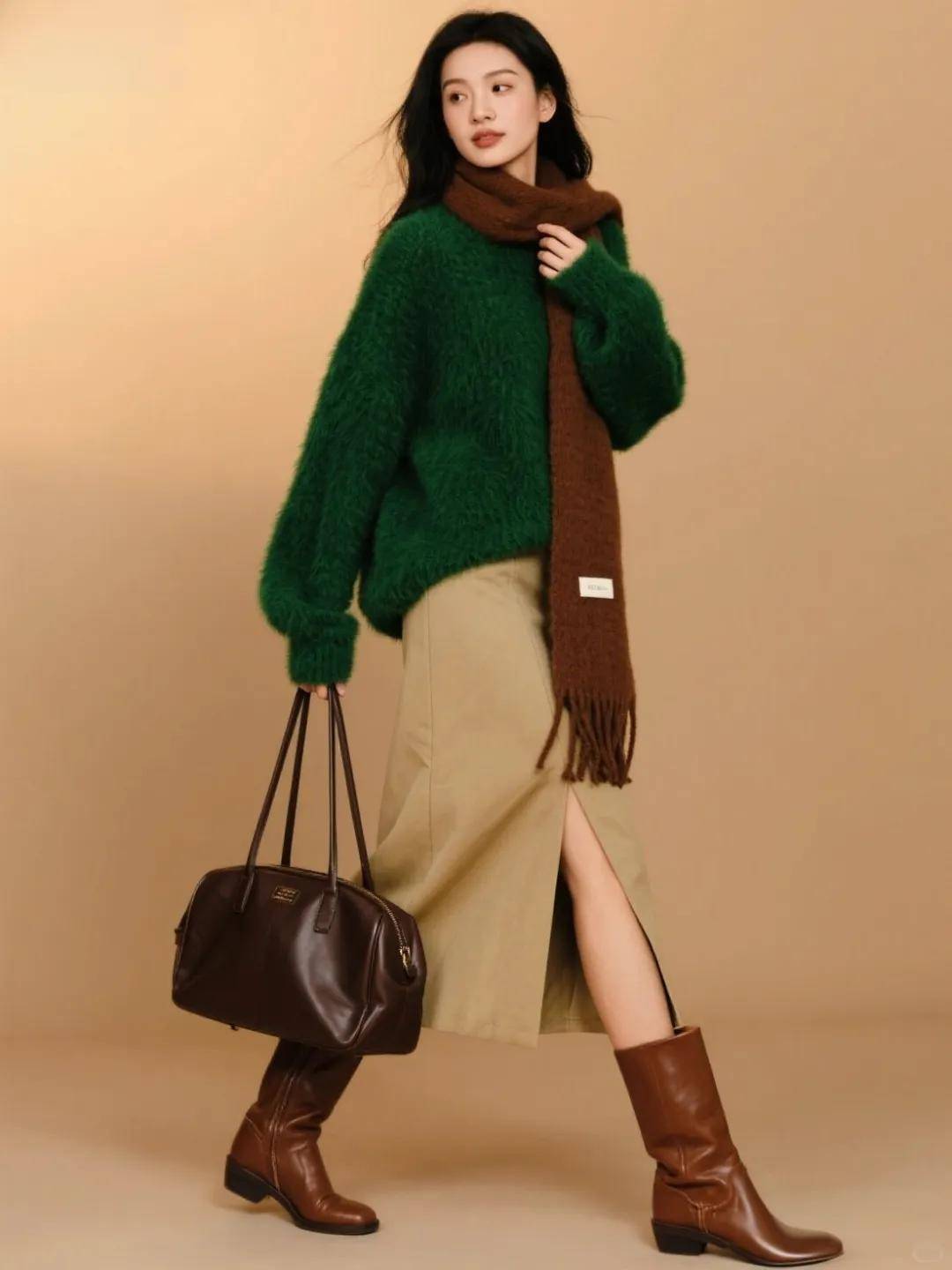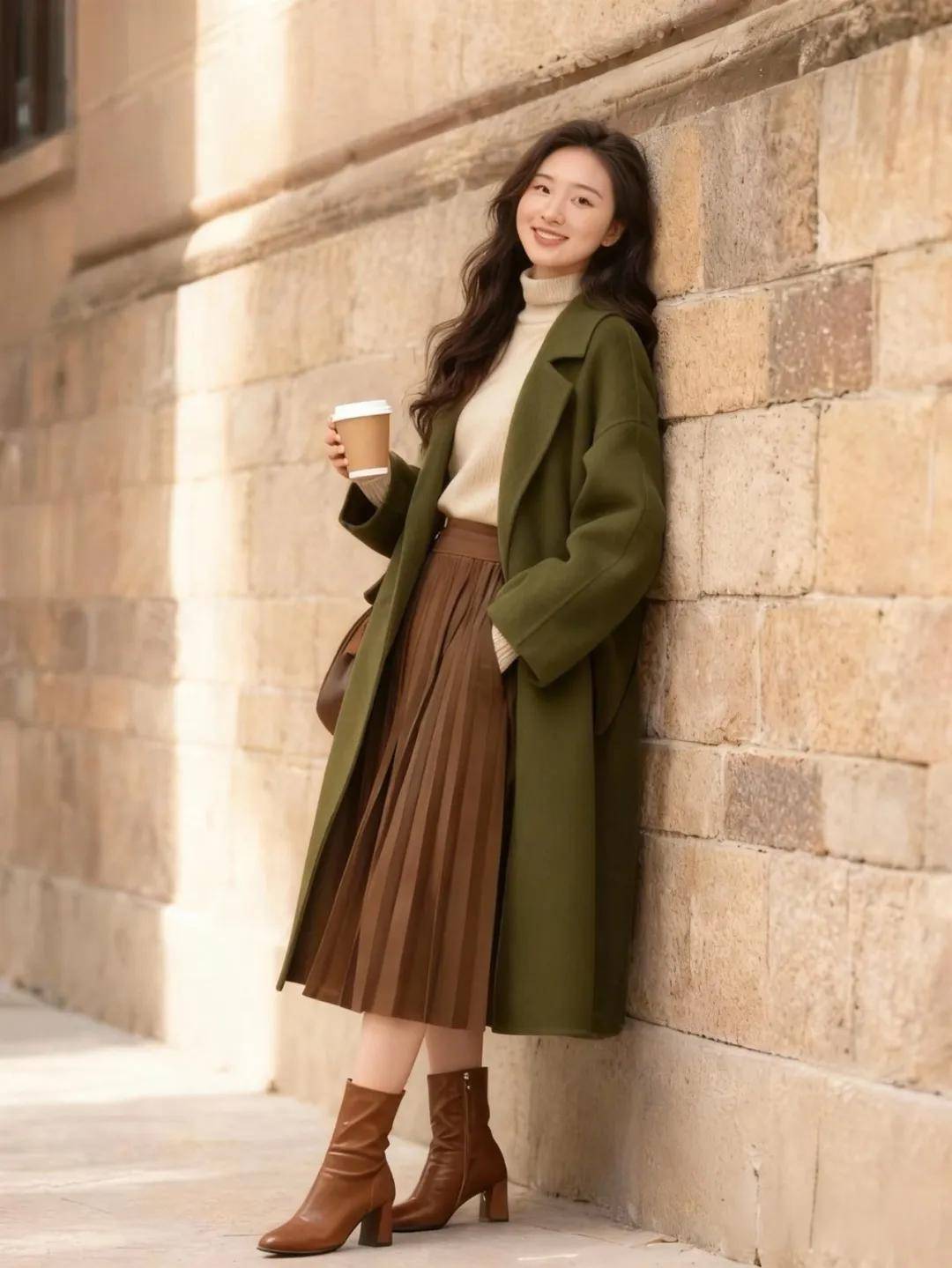 無論是大衣選用橄欖綠色搭配棕色褲子或者裙子,亦或是用棕色的大衣、羽絨服與橄欖綠色的內搭相呼應,都能夠營造出一種和諧而又別具一格的視覺效果。