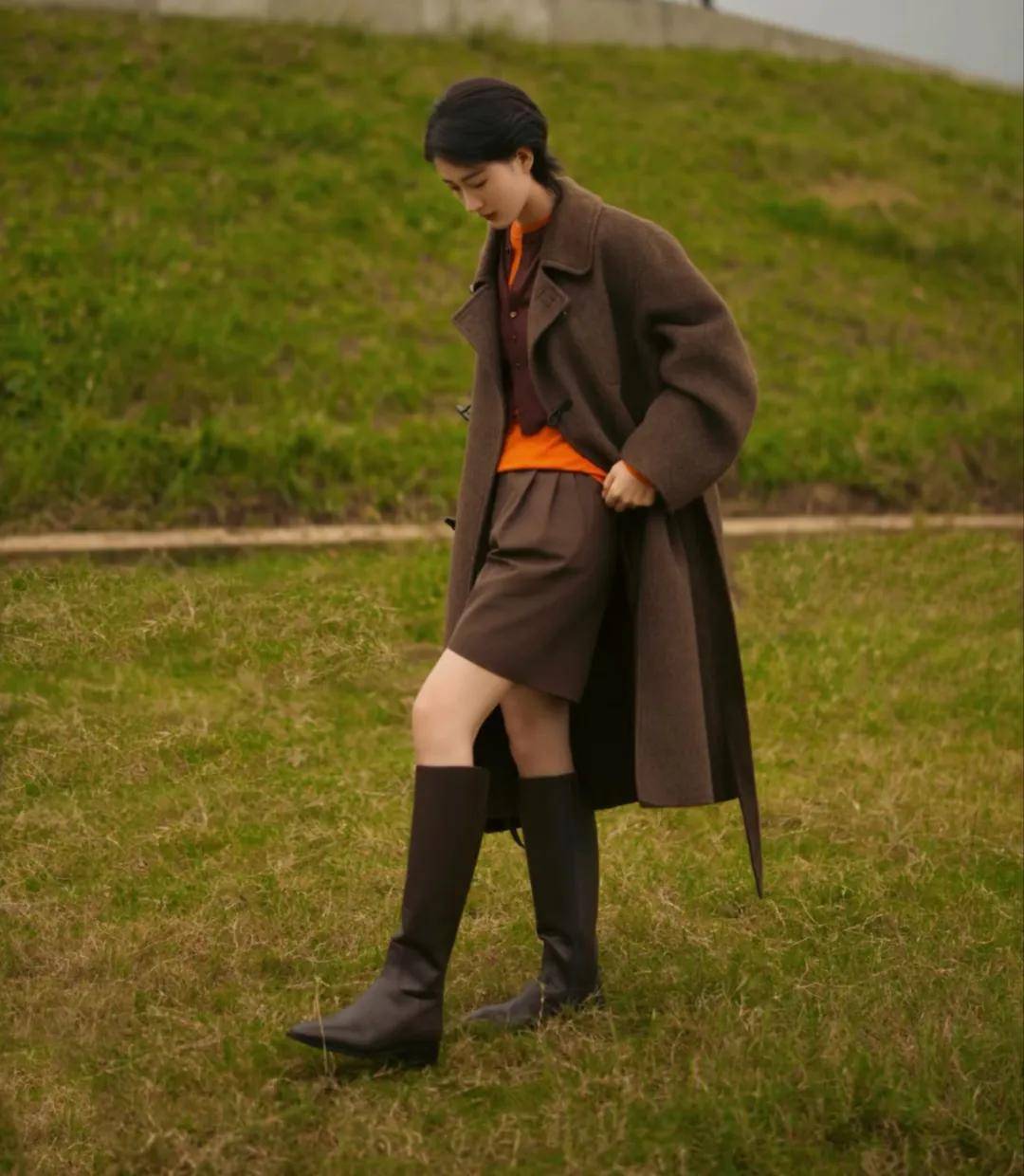 咖色大衣內搭一件咖色的背心再疊穿橙黃色高領毛衣,下配深咖色燈芯絨短褲和長筒靴,,整體色調和諧又不失層次感。