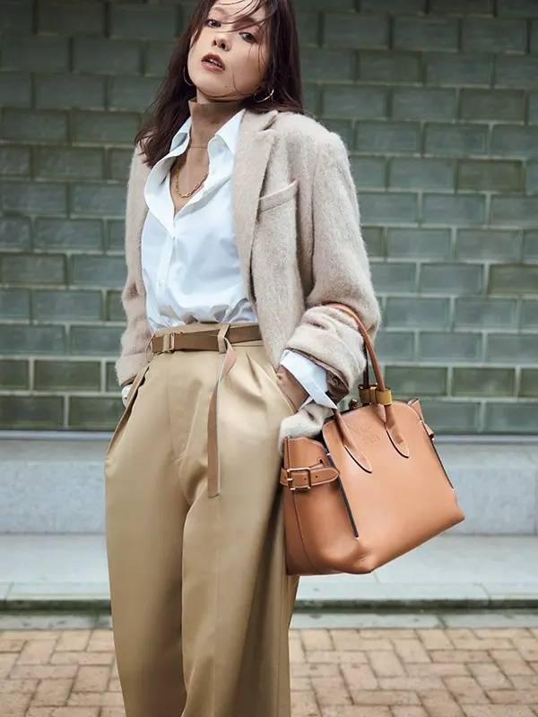 這套職場穿搭中,羊毛柔軟麵料盡顯高級質感。對職場女性而言,"顯貴又順滑的優質材質"是絕對必備條件!若想為通勤造型增添一抹亮色,略帶紅調的棕色係堪稱完美之選。