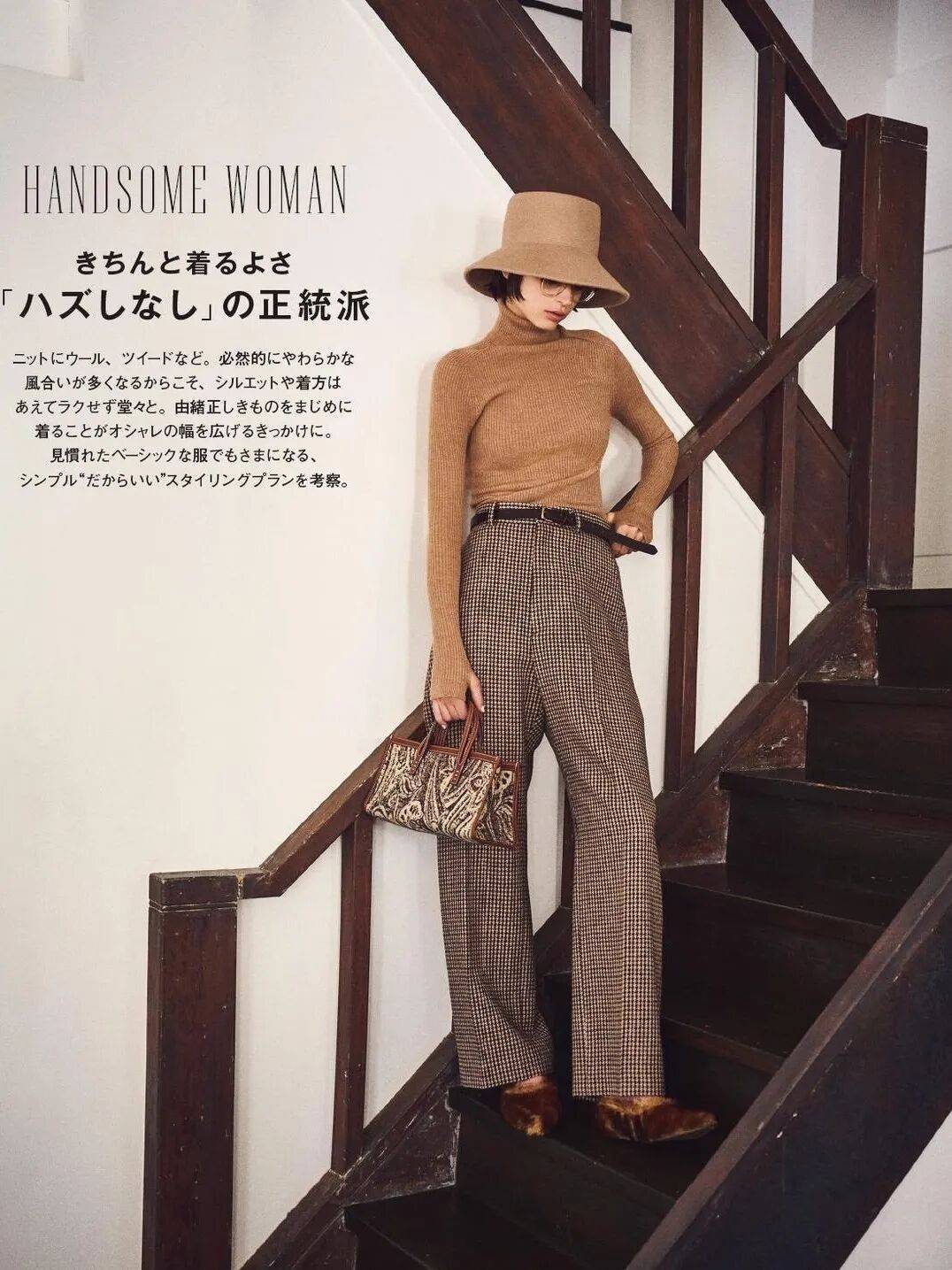 搭配駝色包包、鞋子順色呼應,