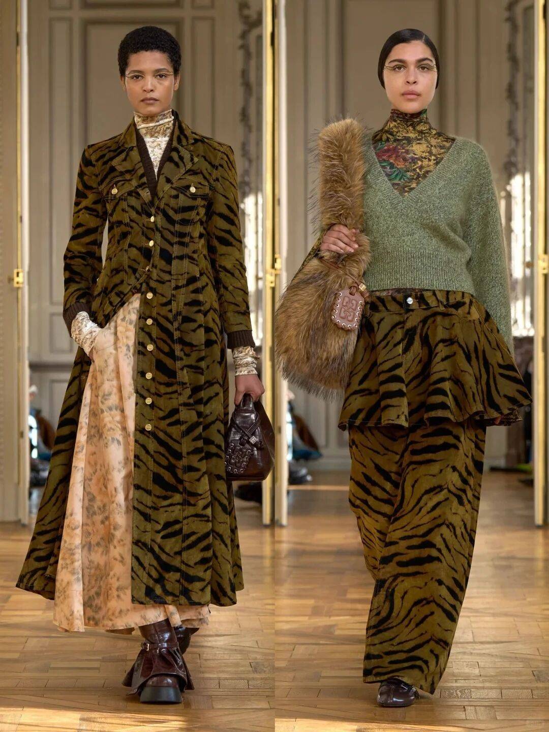遵循 “外簡內繁” 原則,黑色大衣 + 灰色西裝褲是秋冬通勤的萬能組合,但內搭很有創意:疊穿橙色背心 + 豹紋打底,用高飽和亮色的前衛對衝豹紋的野性,用皮草毛領增加奢華。