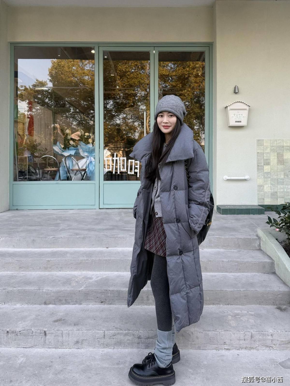 如果想走氣質淑女風,灰色羽絨服搭配半身裙也不錯,直筒半身裙可以修飾胯寬腿粗,降低搭配臃腫感,配合平底德訓鞋,減齡極了。