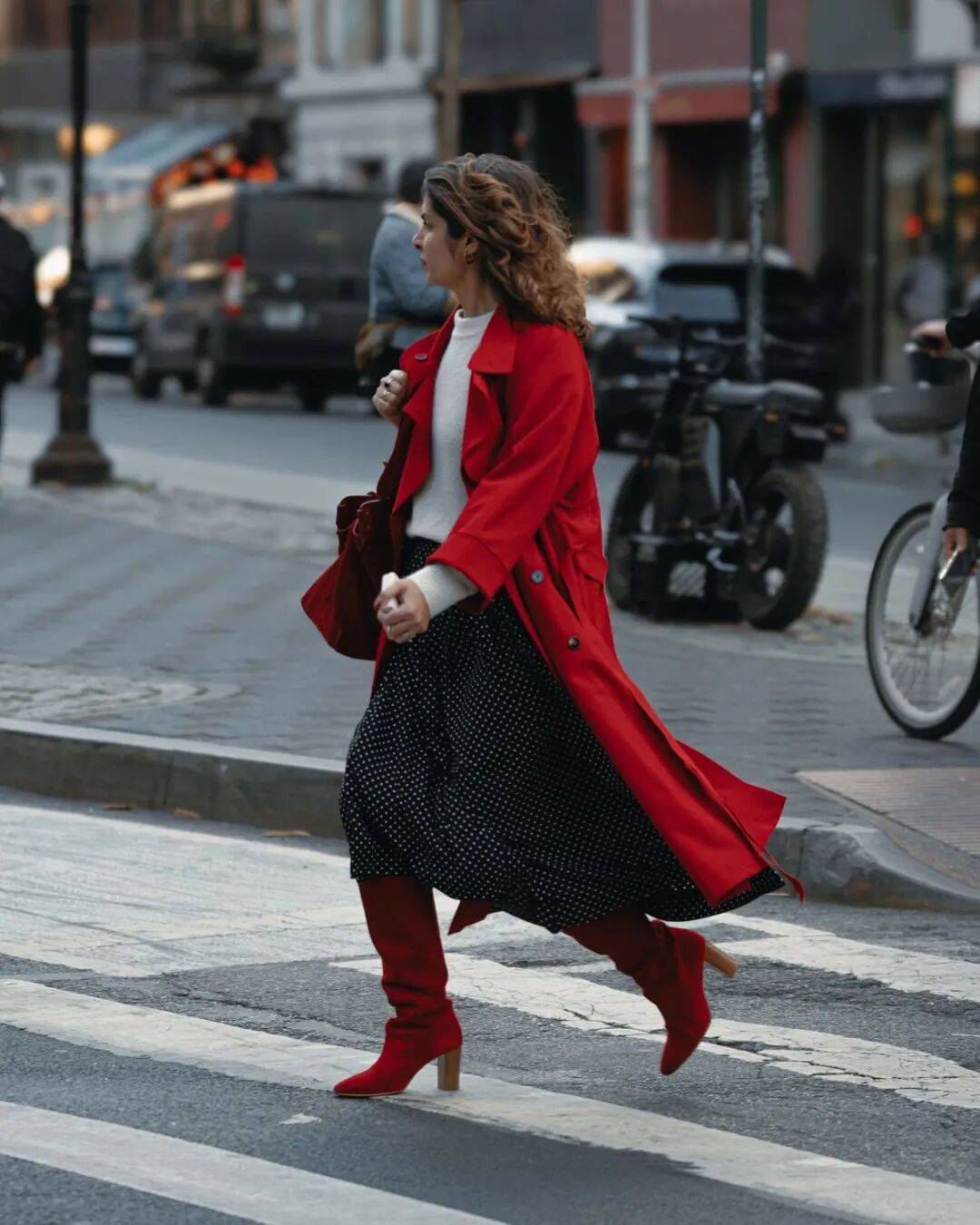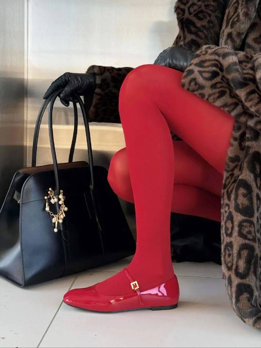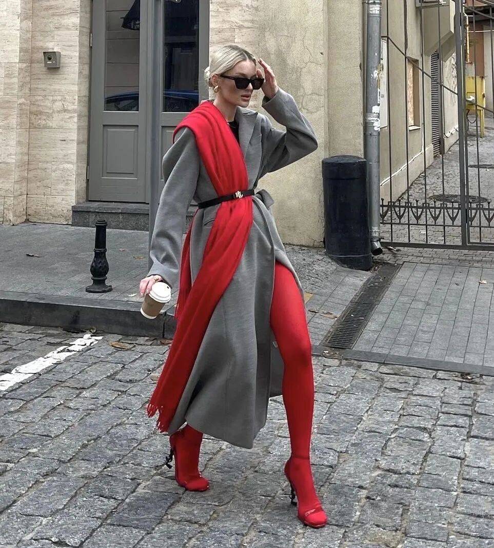 紅色針織襪是藏在細節裏的時尚心思,從靴口露出的一截紅色,上麵可能有精致的絞花紋路,這種不經意的小細節最能體現穿搭巧思。