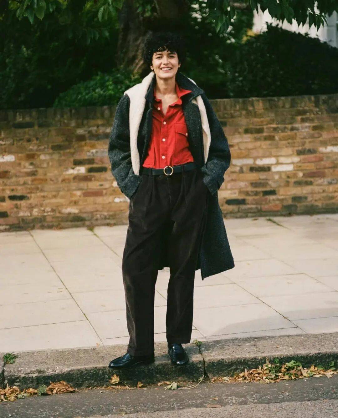 當外套保持簡約時,內搭的紅色便成為造型的靈魂。