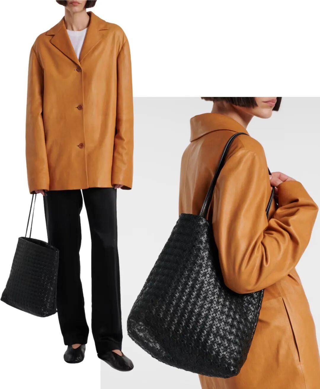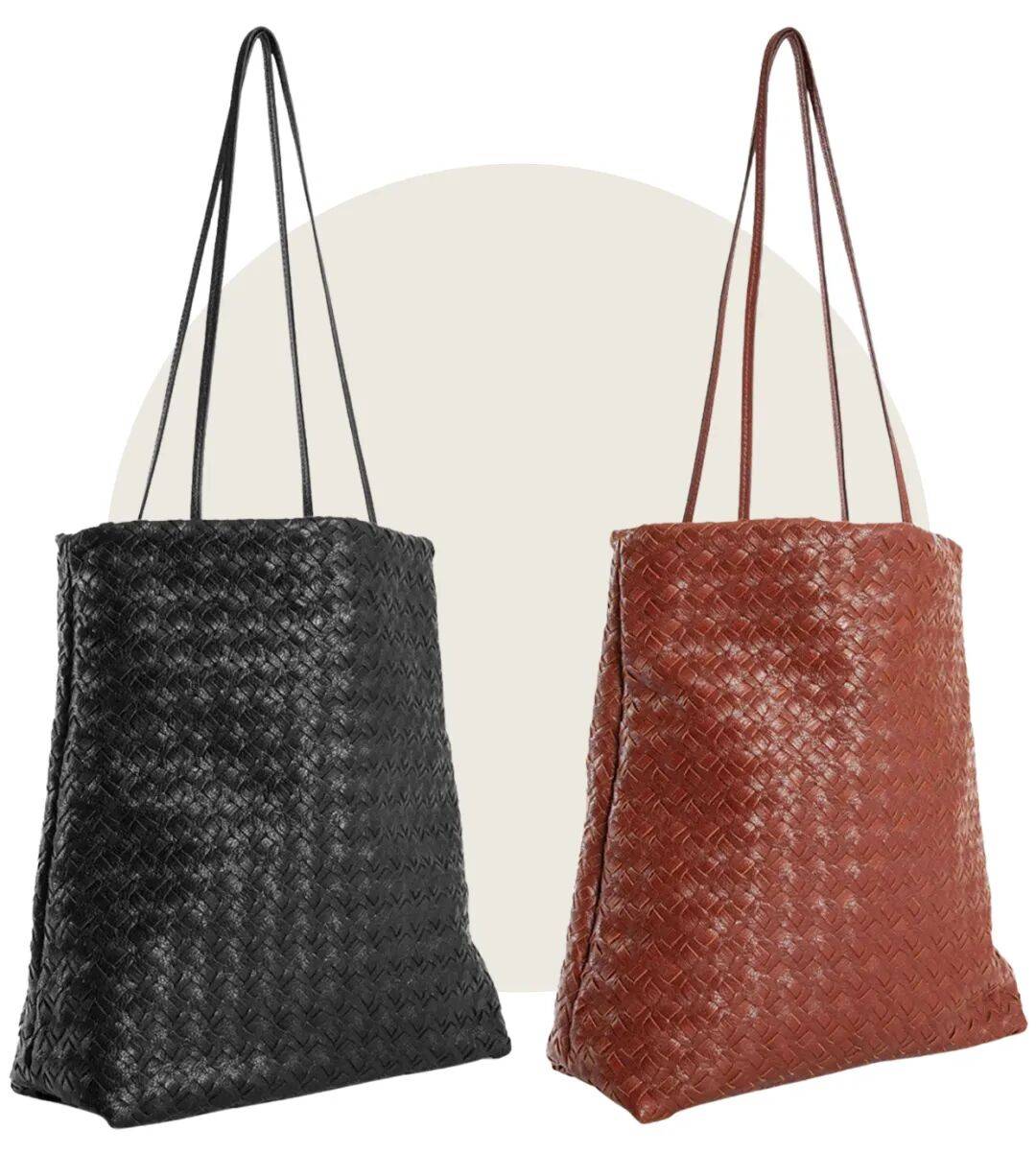 不細看可能大家會誤以為它是BV,不過它與BV Intrecciato將整塊皮革進行裁條再編織的技藝不同的是,the row是在包身上穿孔,再將皮革條交錯穿過,營造出“編織”的感覺。所以整體更顯輕盈,有氛圍感。
