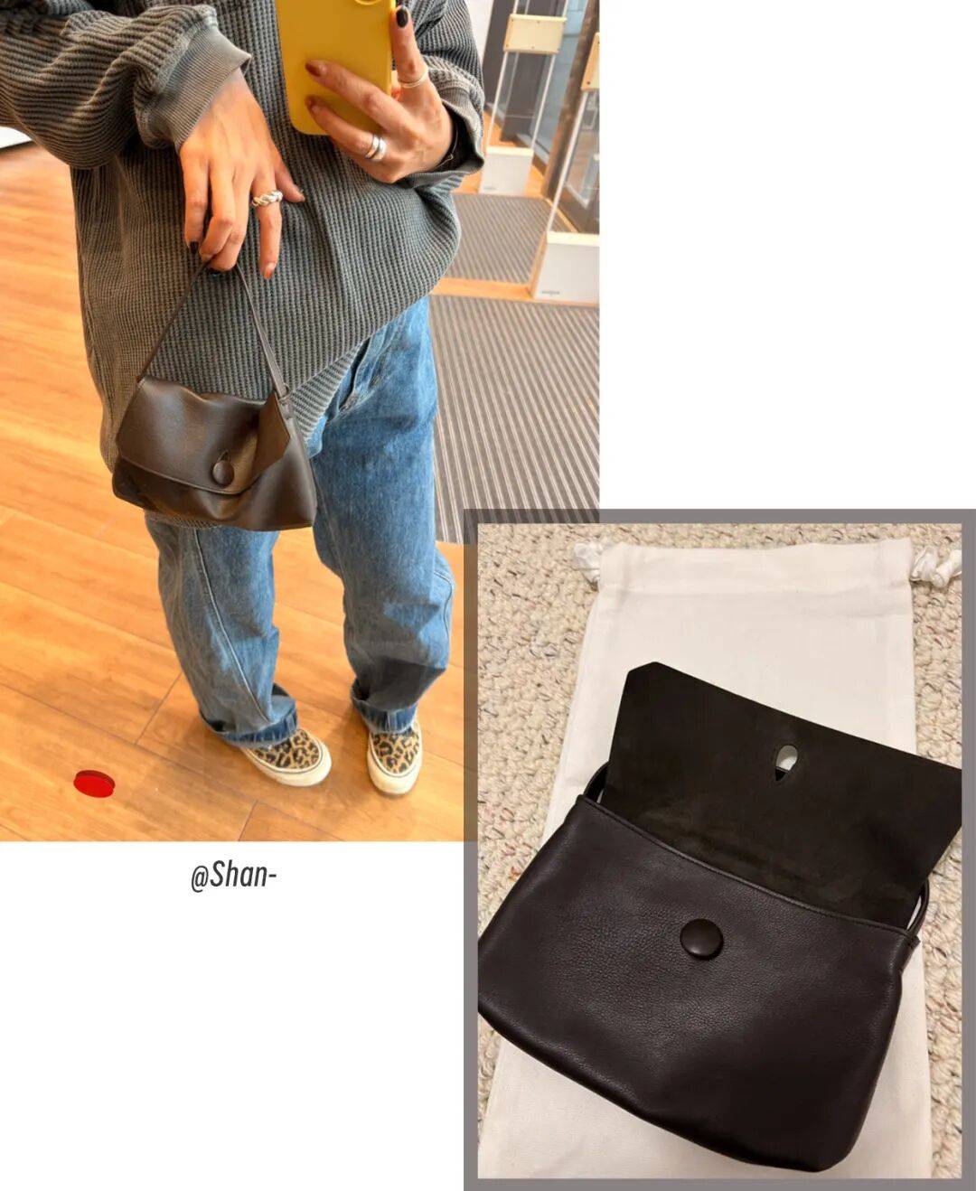 能如此有底氣的運用“紐扣”這種在包袋上並不好操作的開合方式,全都得得益於Sally Bag采用的牛胎皮皮革,這是一種上等的小牛皮革,主打一個軟糯順滑、不易變形。