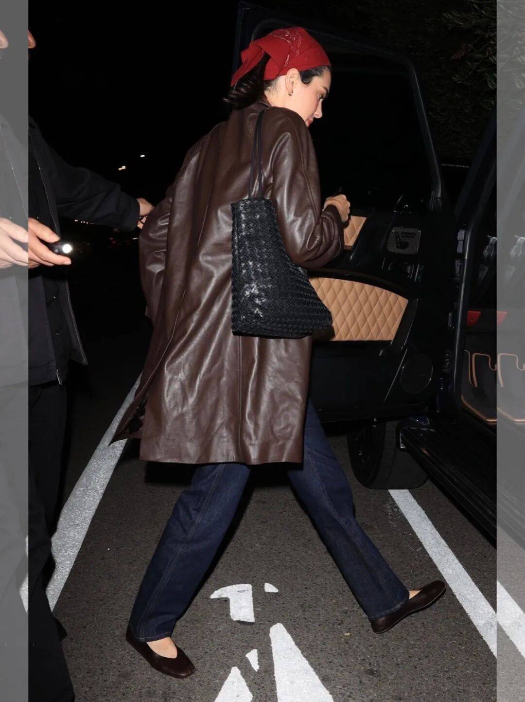 沒有logo加身,簡單的皮衣、簡單的牛仔褲和一隻簡單的the row編織托特包。說不上來造型有多出彩,但就是滿屏時髦。她身上的這隻是品牌今年早秋係列的新品,也是上架就售罄了,它在中國官方的售價是3w左右。