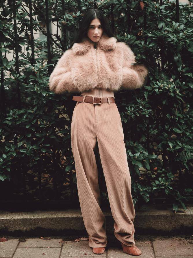 廓形創新——短款皮毛一體夾克搭配闊腿牛仔褲,硬挺牛仔中和絨麵慵懶;長款搖粒絨外套內搭露臍短裙,甜酷反差感拉滿。
