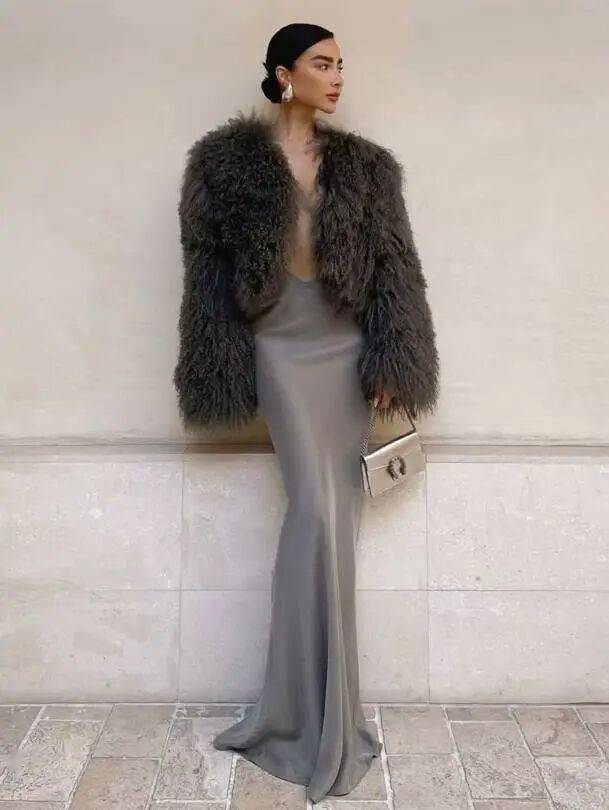 為了與長款皮草的蓬鬆感形成對比,建議選擇修身的連衣裙作為內搭。在色彩上,可以選擇與皮草顏色相近或形成對比的連衣裙。