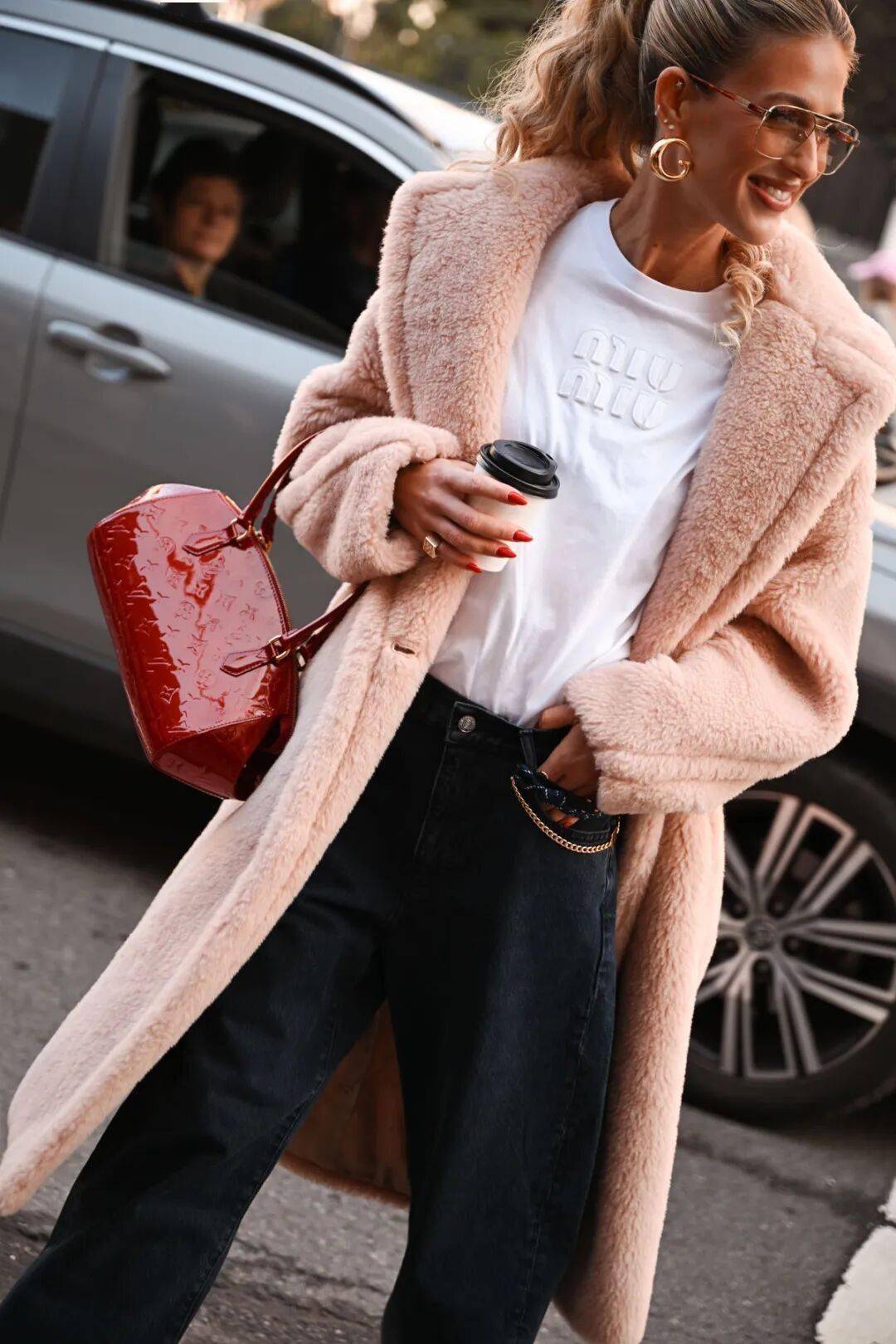 避免全身毛絨堆砌,用皮質腰帶、金屬項鏈等硬質元素平衡柔軟。