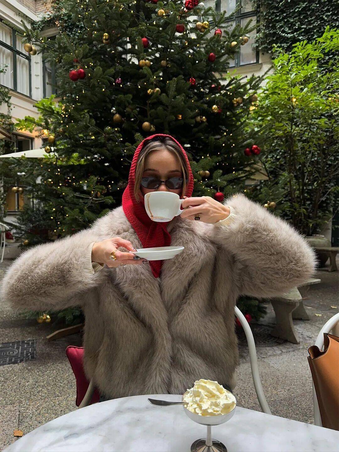 薄荷綠、霧霾藍等低飽和亮色皮草,內搭吊帶或緞麵裙,搭配流蘇耳環、絲絨發箍,輕鬆化身年末派對焦點。