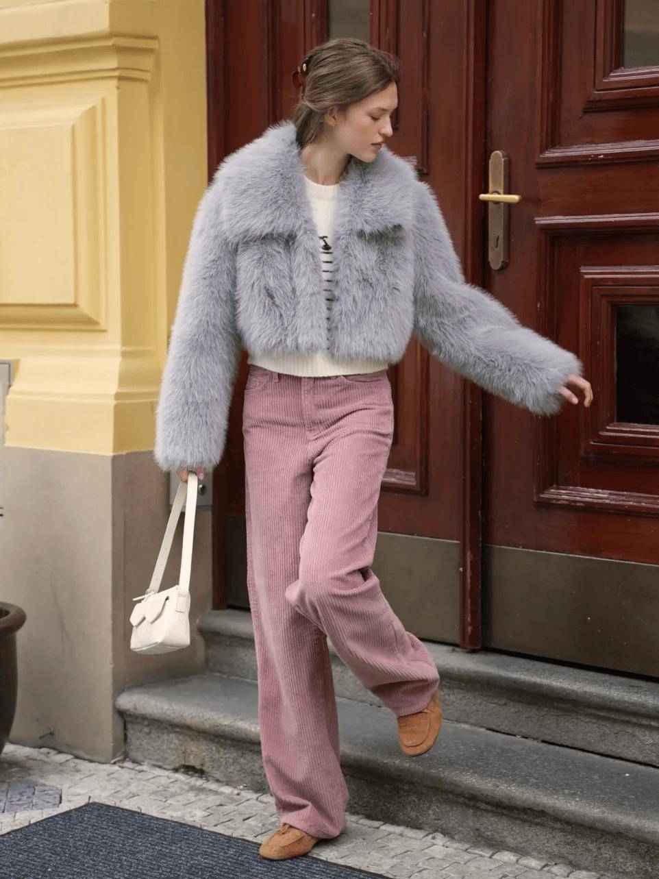 通勤小心機:短款皮草+高腰闊腿褲+樂福鞋