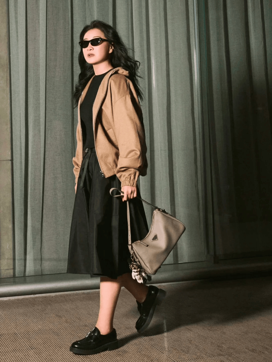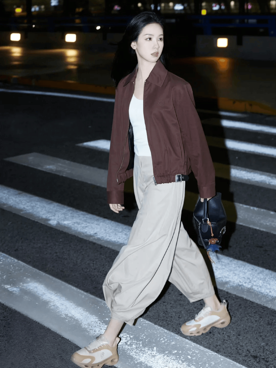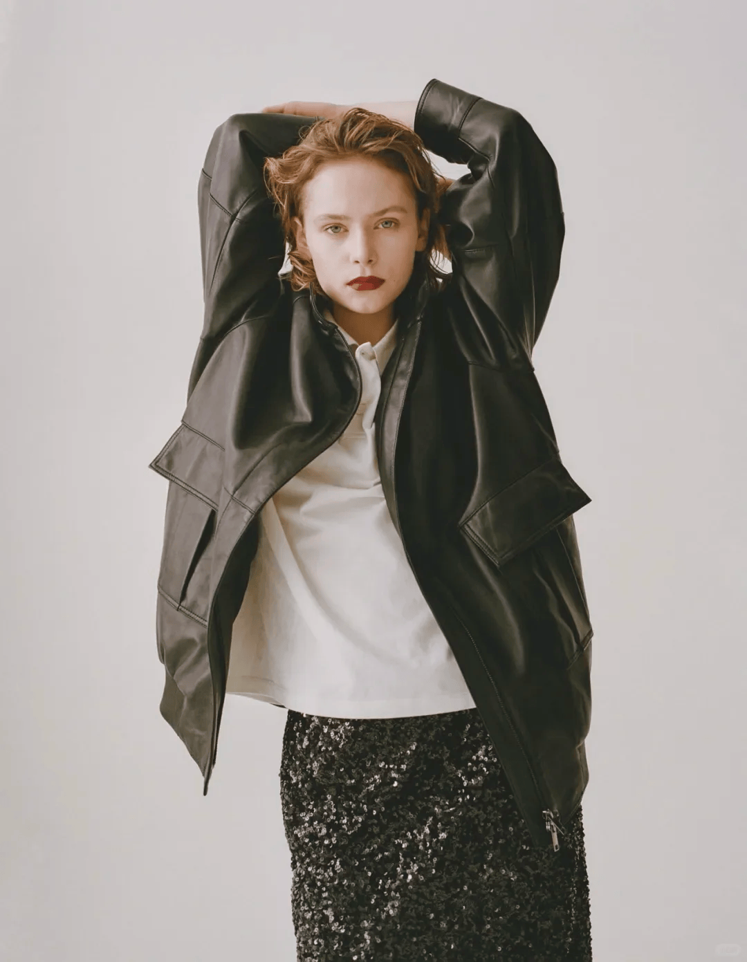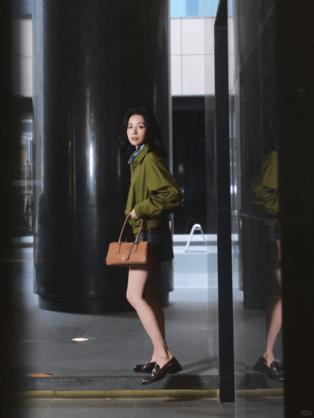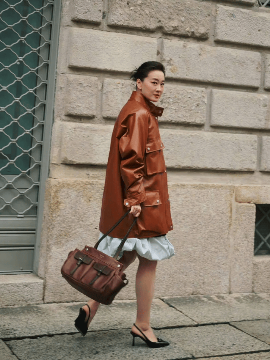 一套工裝皮外套+泡泡裙的搭配,襯托她幹練而堅定的氣場。