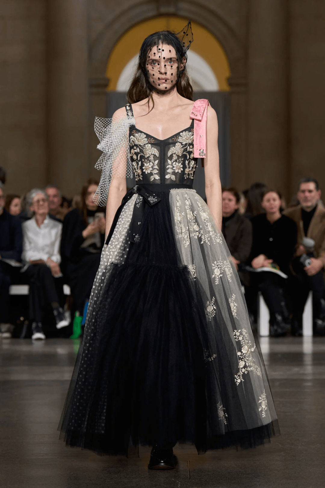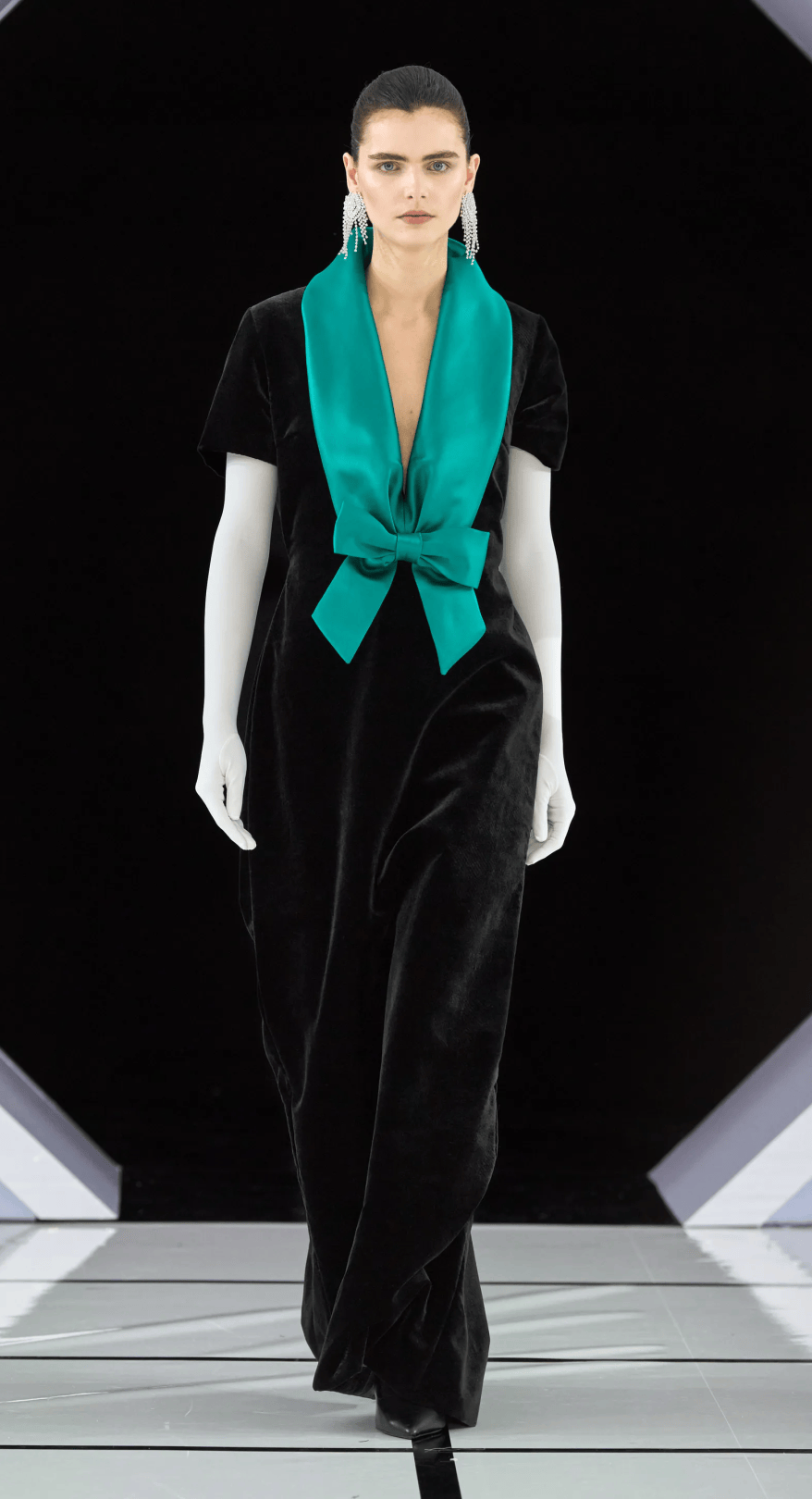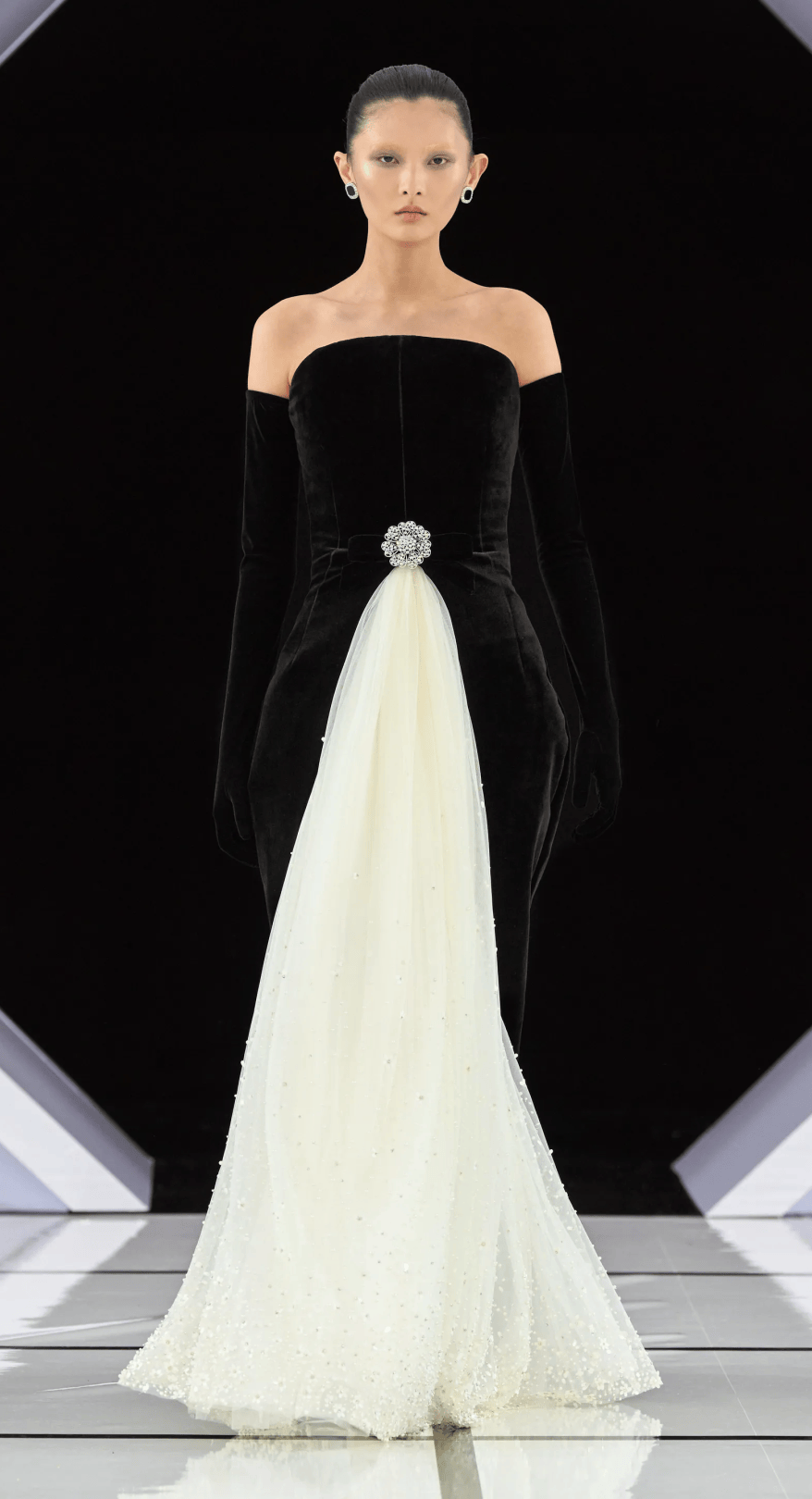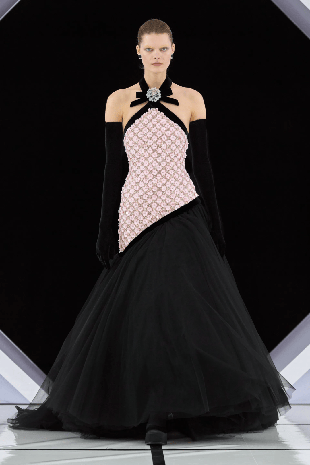 大秀選址在古典音樂廳的黑白幾何T台,拱門下的黑色絲絨背景,不僅增添一抹神秘感,也讓設計與細節更加直觀呈現。