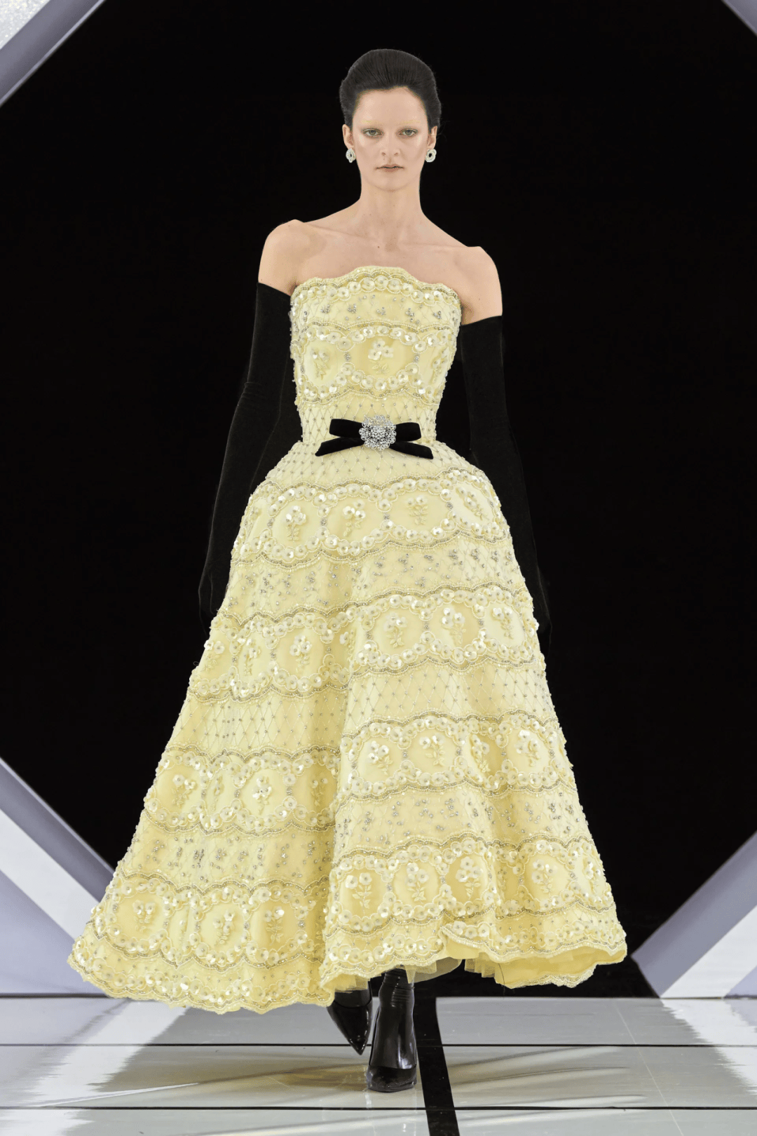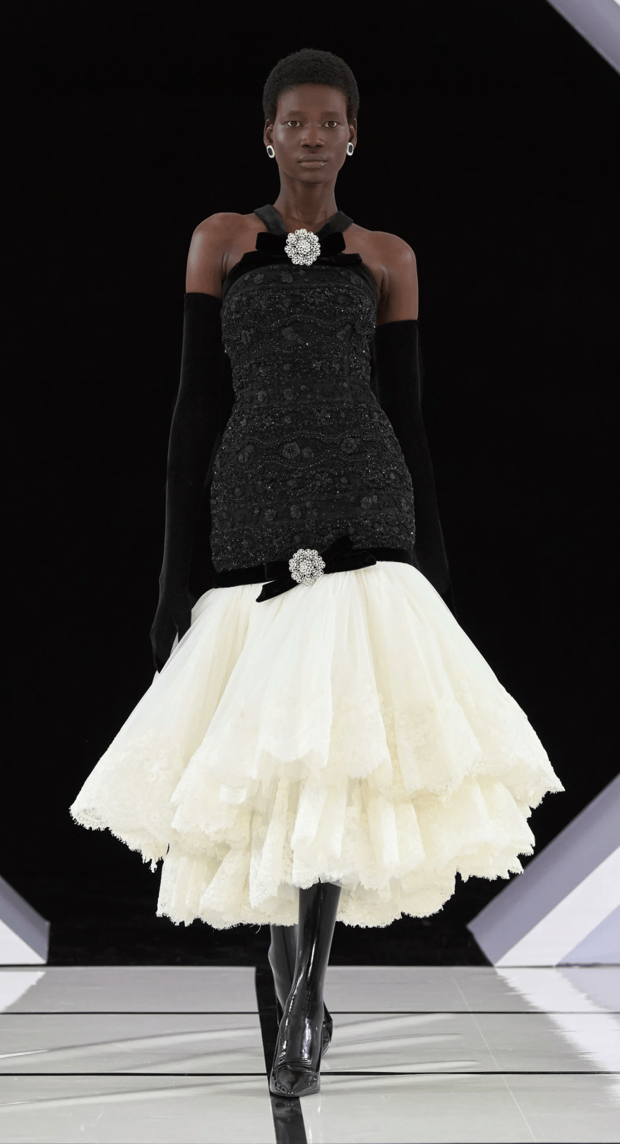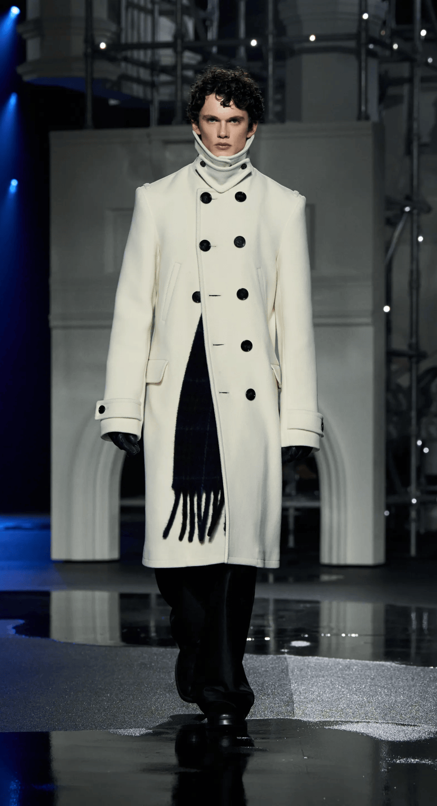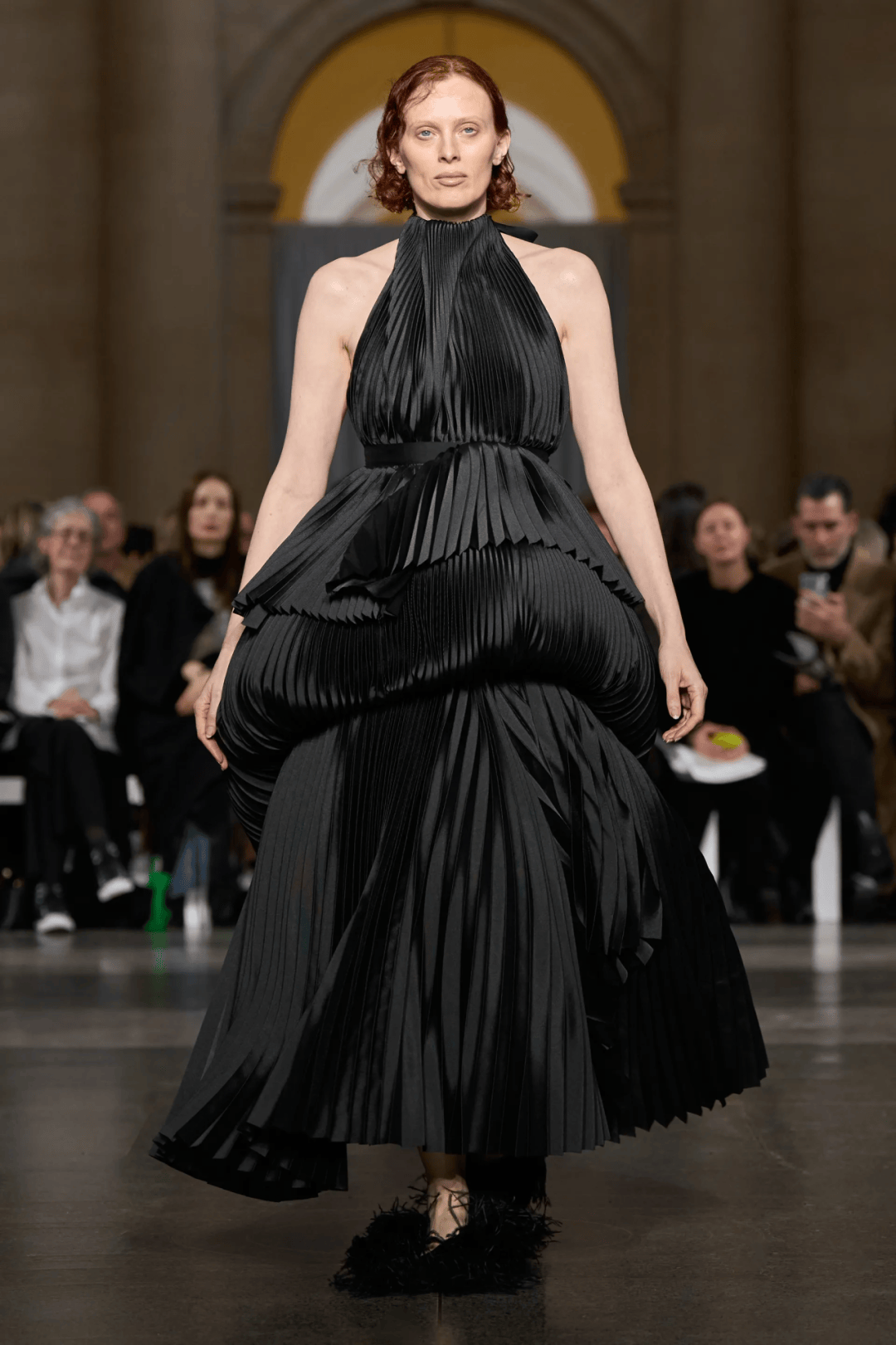 大秀選址在古典音樂廳的黑白幾何T台,拱門下的黑色絲絨背景,不僅增添一抹神秘感,也讓設計與細節更加直觀呈現。