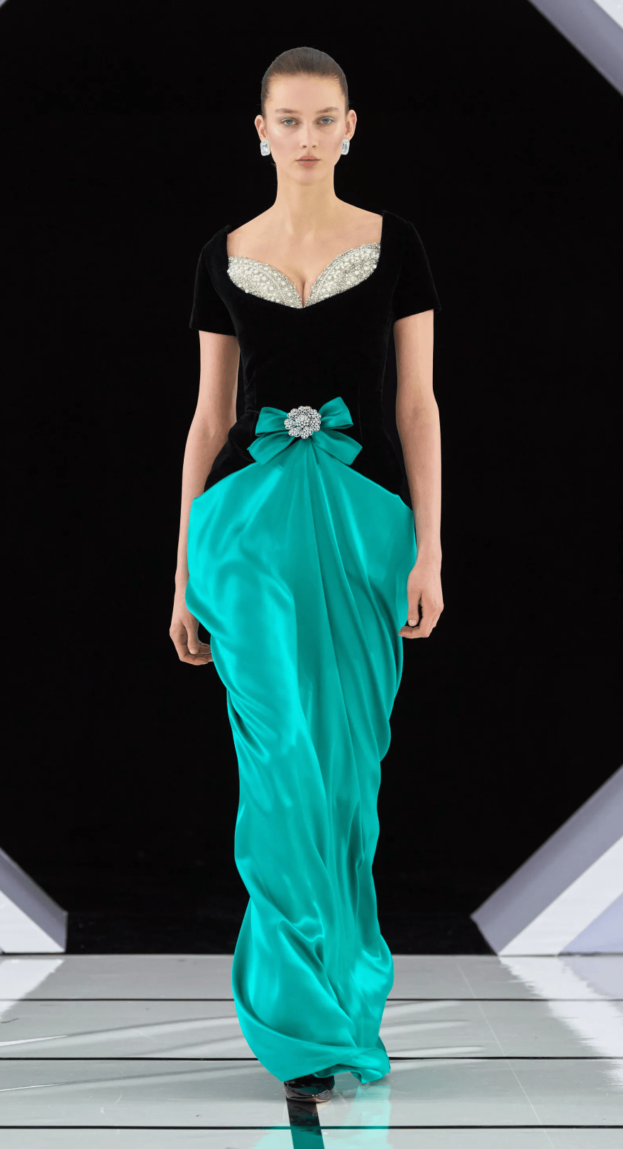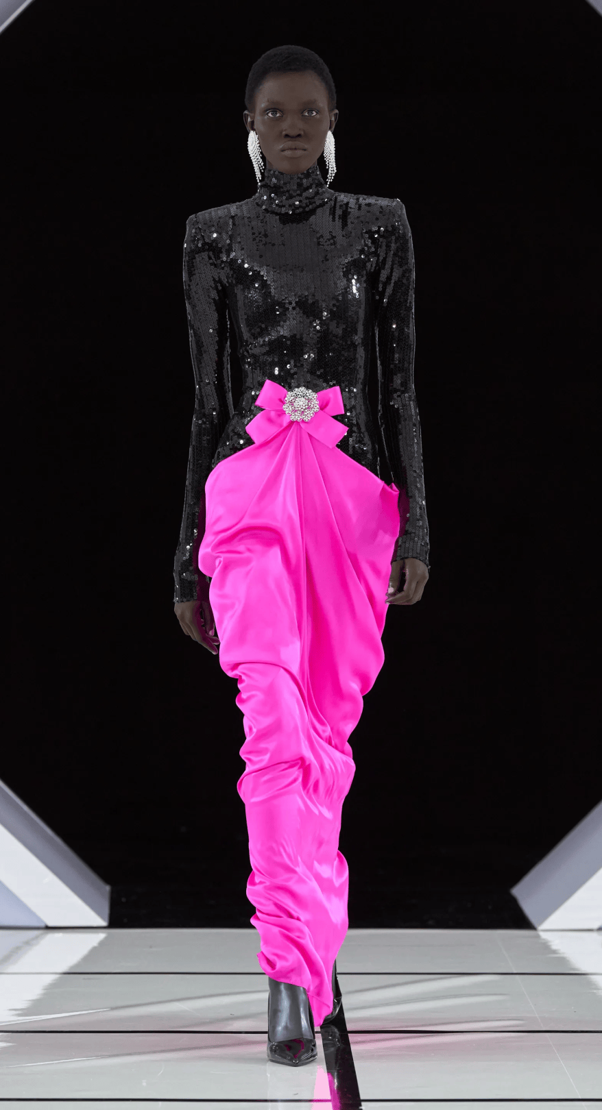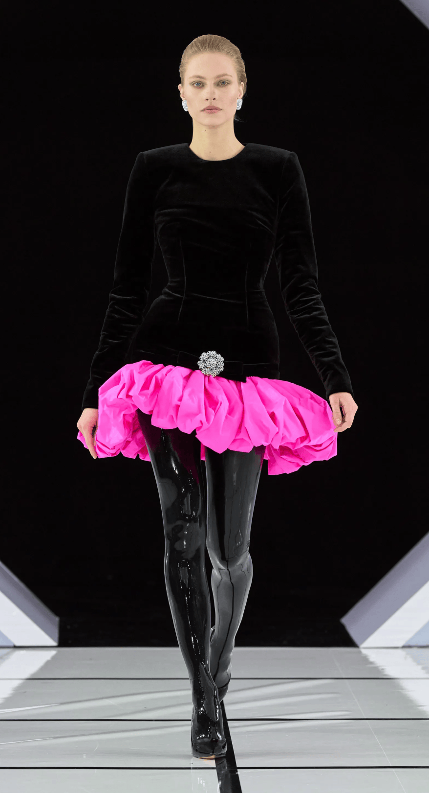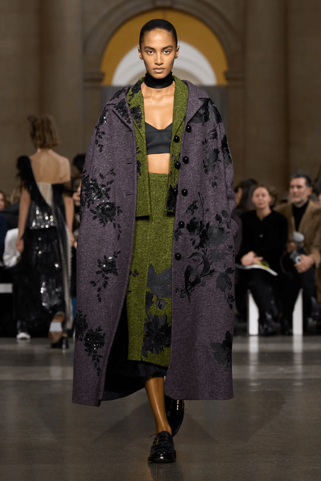 大秀選址在古典音樂廳的黑白幾何T台,拱門下的黑色絲絨背景,不僅增添一抹神秘感,也讓設計與細節更加直觀呈現。