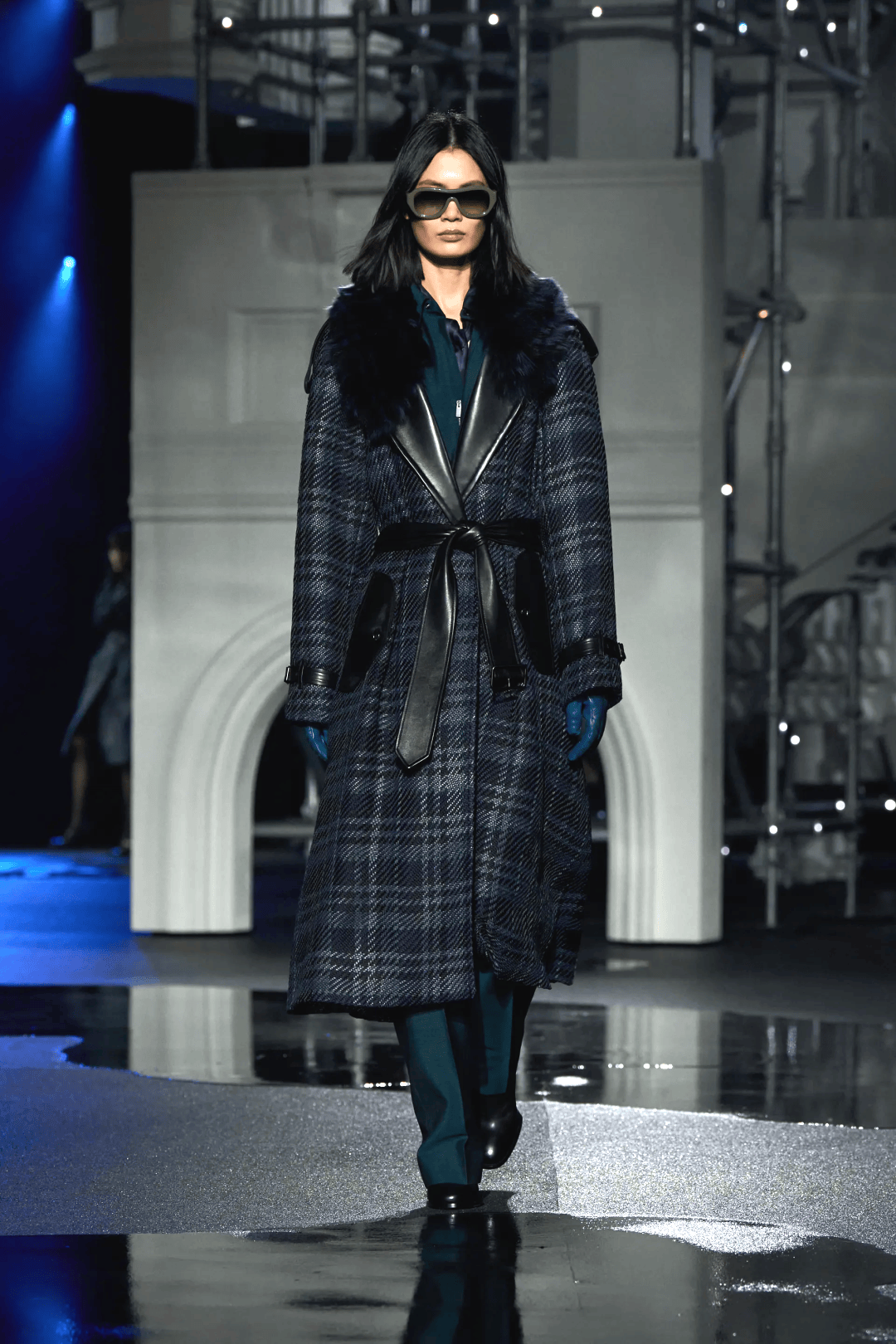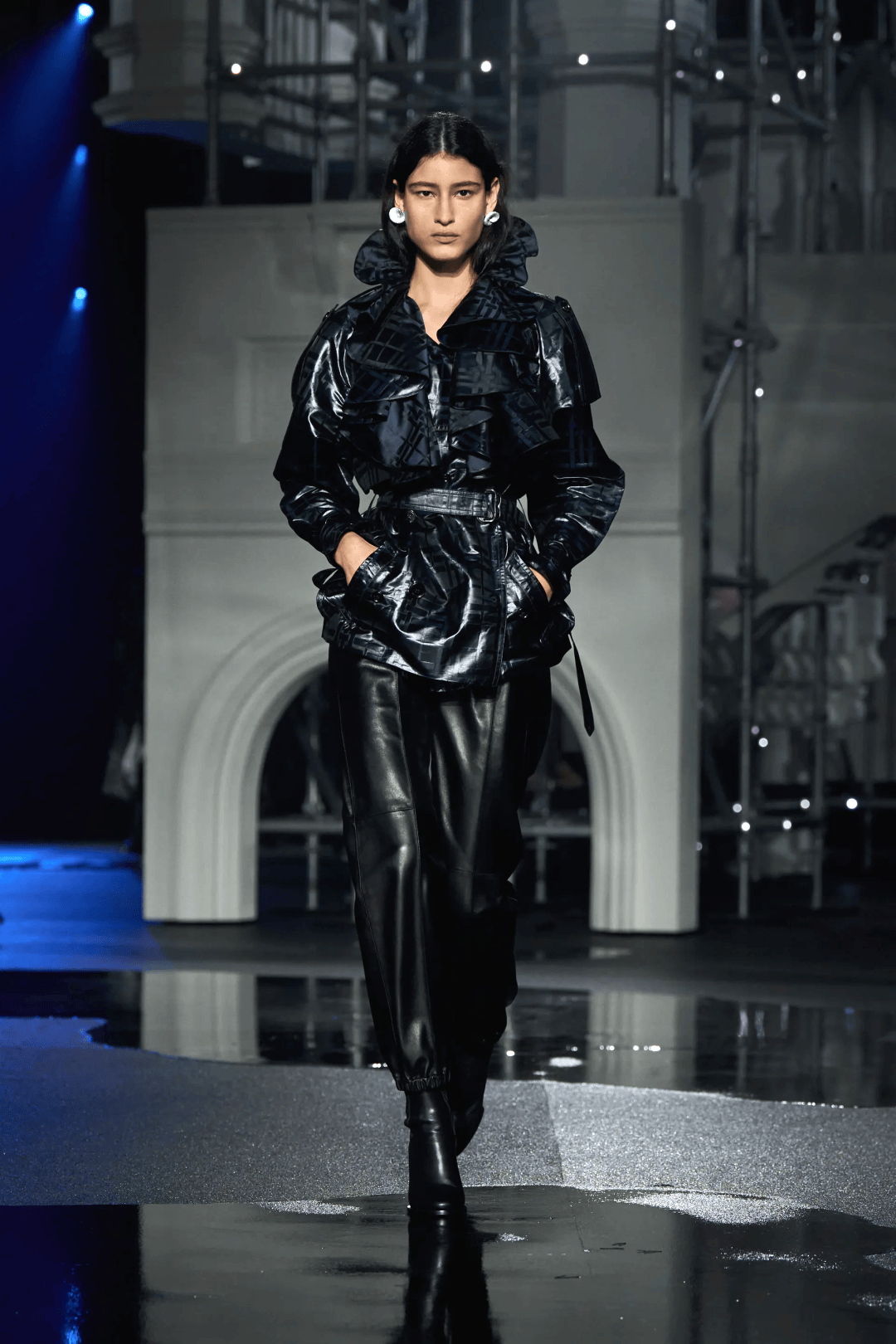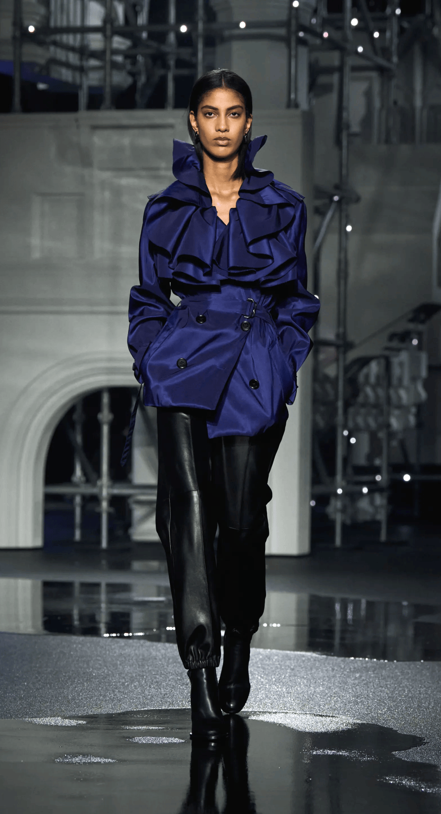 短款荷葉邊領風衣,則以閃亮的黑色格紋麵料呈現,搭配黑色皮褲或皮裙,更顯力量感。