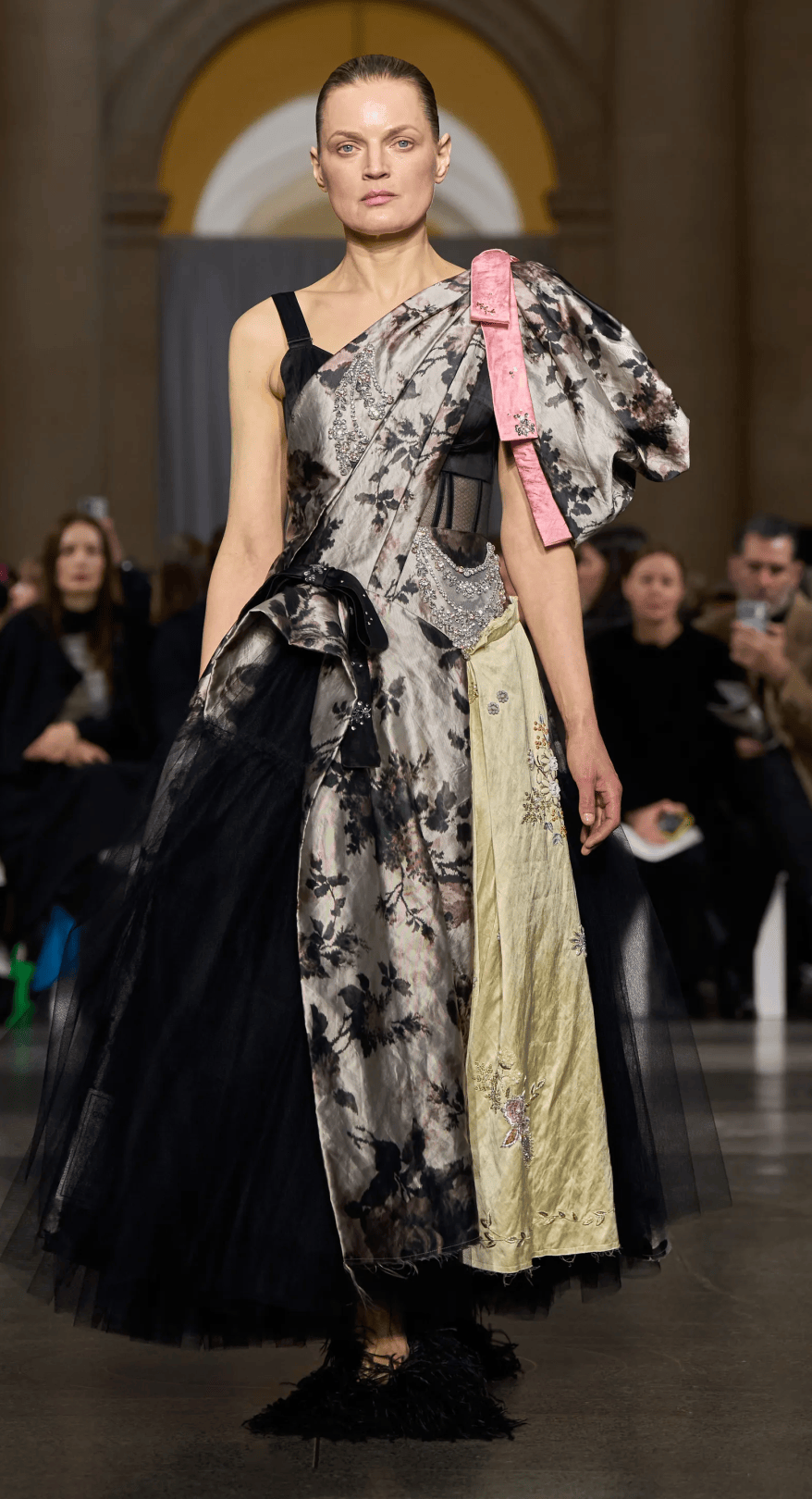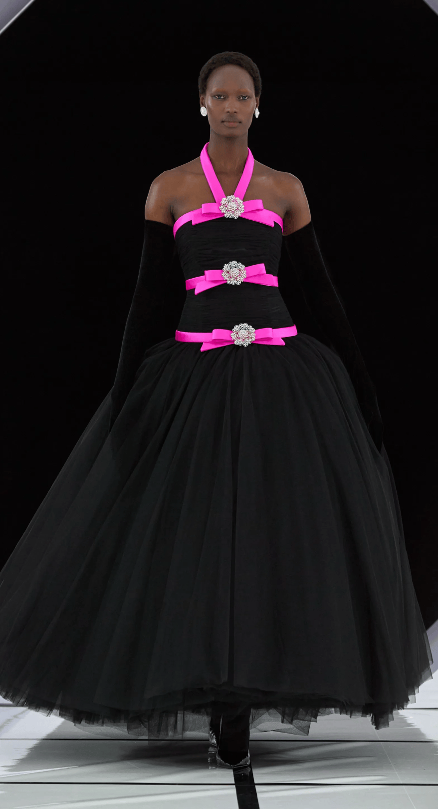 值得一提的是,Richard Quinn用高飽和色彩與黑色絲絨、蓬紗結合,讓禮服即使在黑布的映襯下,也依然耀眼。
