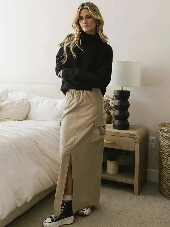 黑色立領針織毛衣,能塑造幹練與力量感,還能輕鬆呈現女性的氣質魅力,搭配一件卡其色工裝半裙,讓整個造型彰顯大氣,高級又時髦,穿上一雙帆布鞋更是個性感十足, 更突顯女性的智性高級感