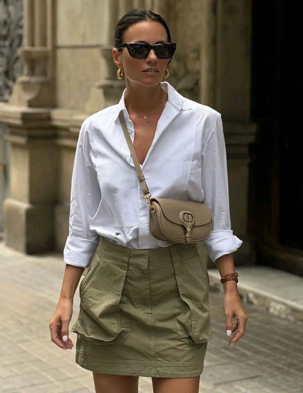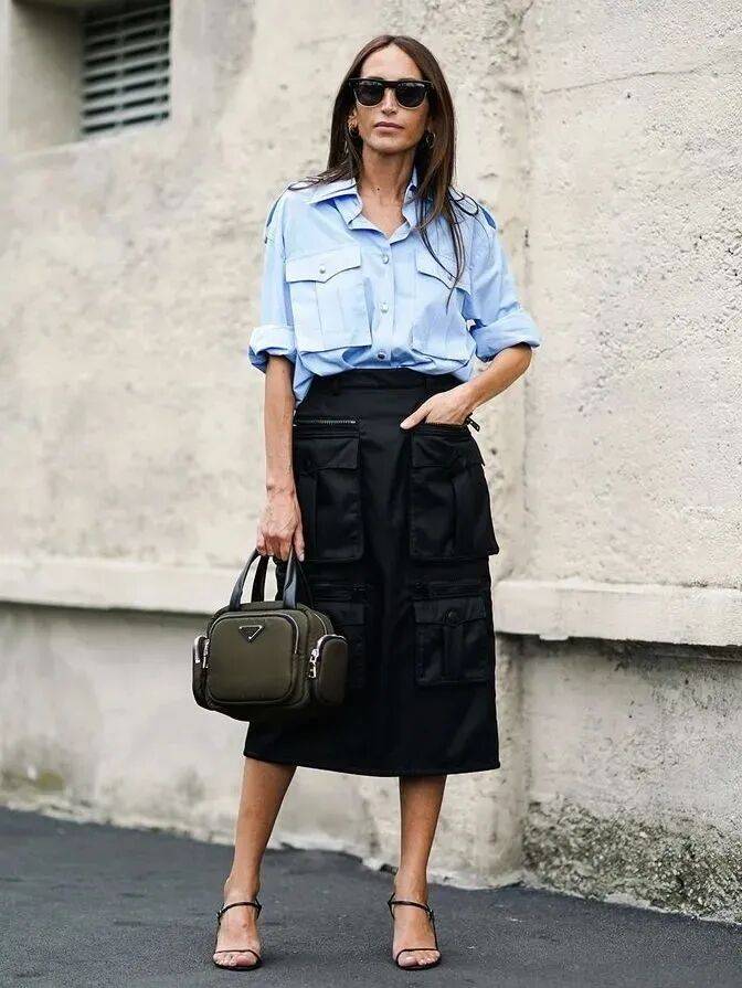 白色襯衫,白色能夠塑造風格的大氣讓穿者看起來更有高級感,搭配一件卡其色工裝半裙,瞬間讓你脫穎而出下角塞腰裏,充滿了大女人的氣場,下角塞腰裏係上腰帶,即使沒有完美身材,也能穿出大氣感!!