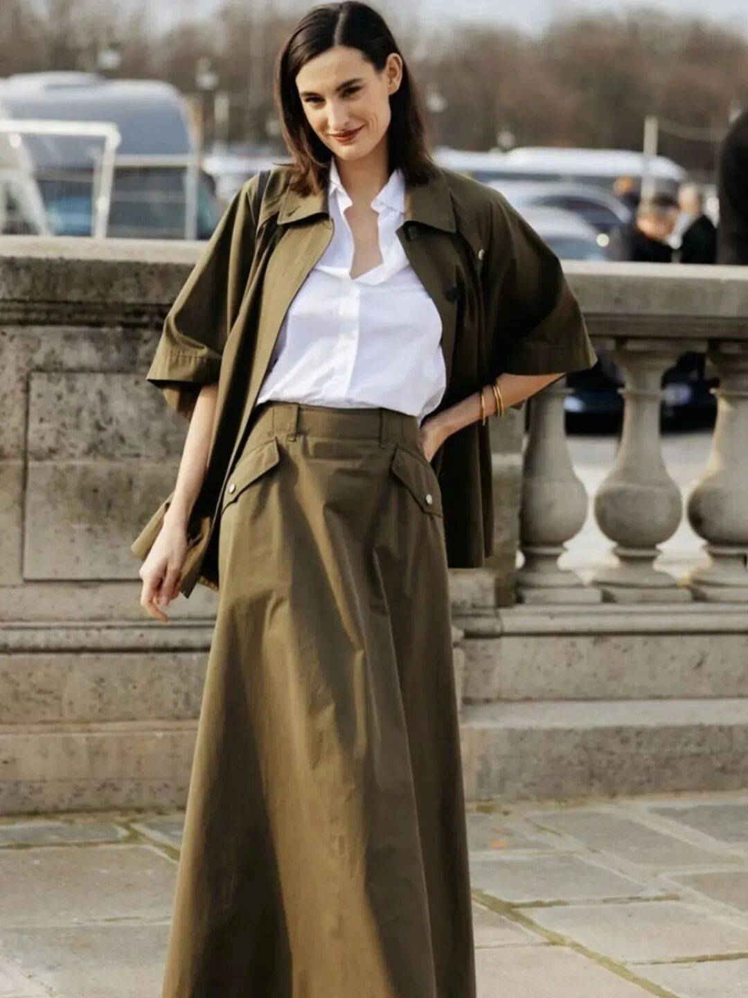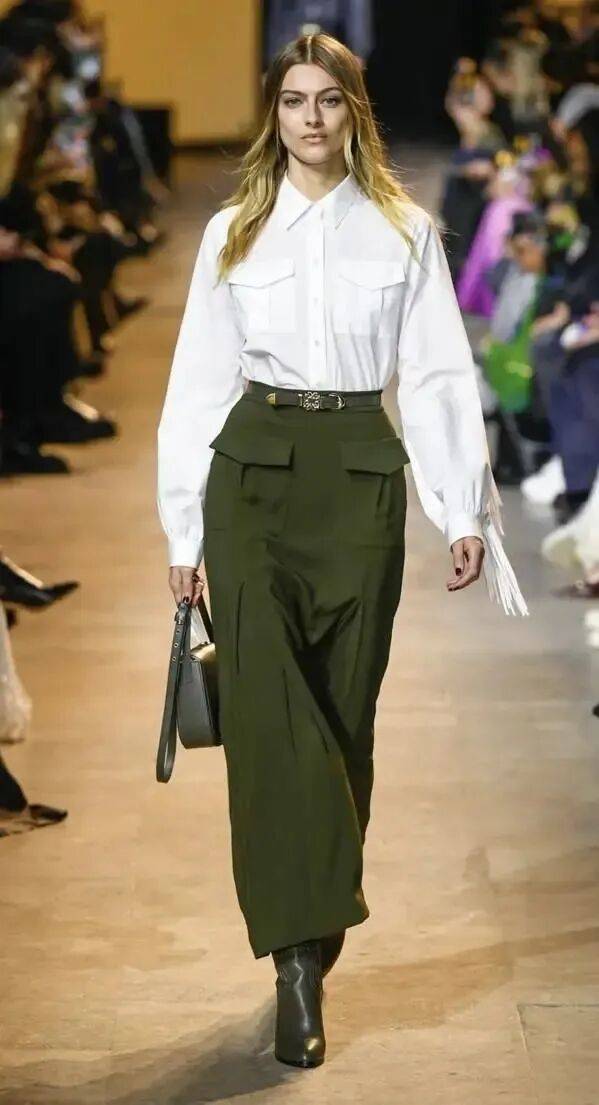 白色襯衫,能輕鬆穿出早春獨有的休閑幹練時髦感,瞬間營造出強大氣場,搭配一件軍綠色工裝半裙,利落中帶著颯爽,氣場全開,下角塞腰裏真的超顯氣質,搭配一雙靴子,視覺上更顯瘦複古又摩登