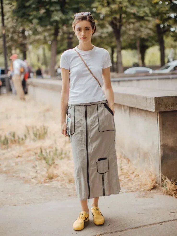 白色圓領T恤,容易給人親近的感覺更是休閑感十足,搭配一件灰色工裝半裙,能讓你的整體穿搭更加和諧顯幹練女人味,搭配一雙黃色運動鞋,有種恰到好處的隨意,又彰顯了個性