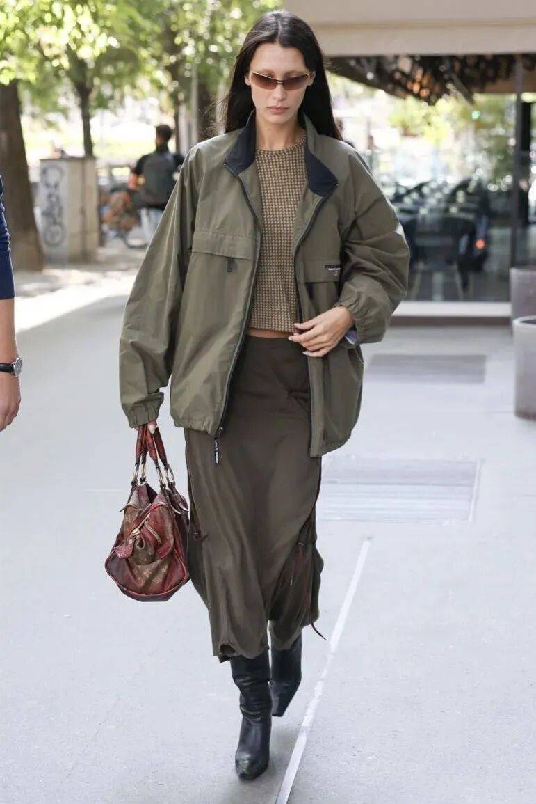 綠色夾克外套,利落之中帶點休閑盡顯幹練大女人氣場,內搭一件短T恤,展示女人的獨特魅力,搭配一件深咖色半裙,能感到一種魄力氣勢,搭配一雙黑色靴子,能輕鬆穿出幹練又有力量的氛圍