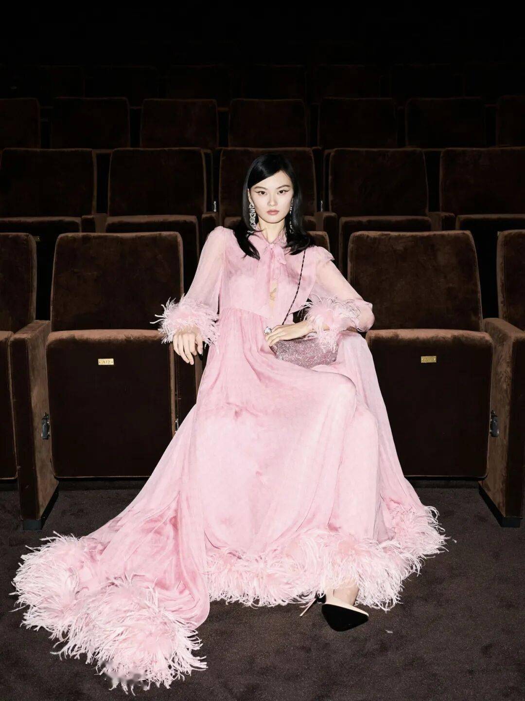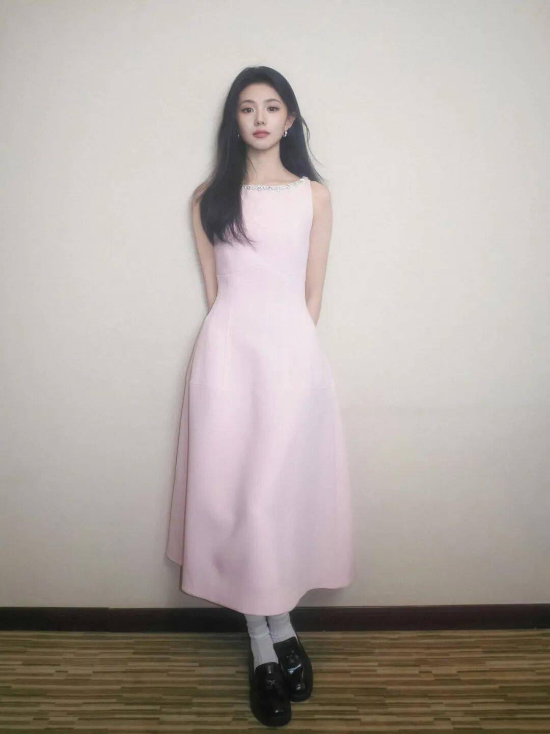 當蘭花粉被放進更正式的公共場景時,往往會呈現出另一種氣質。演員劉浩存在“紅星照耀中國”宣傳活動上身穿MAIDIREMAI粉色長裙亮相,簡潔剪裁與柔軟麵料讓造型顯得端莊而自然。蘭花粉在她身上多了一層書卷氣的溫和感,沒有過度裝飾,通過線條與比例呈現出幹淨的女性氣質。