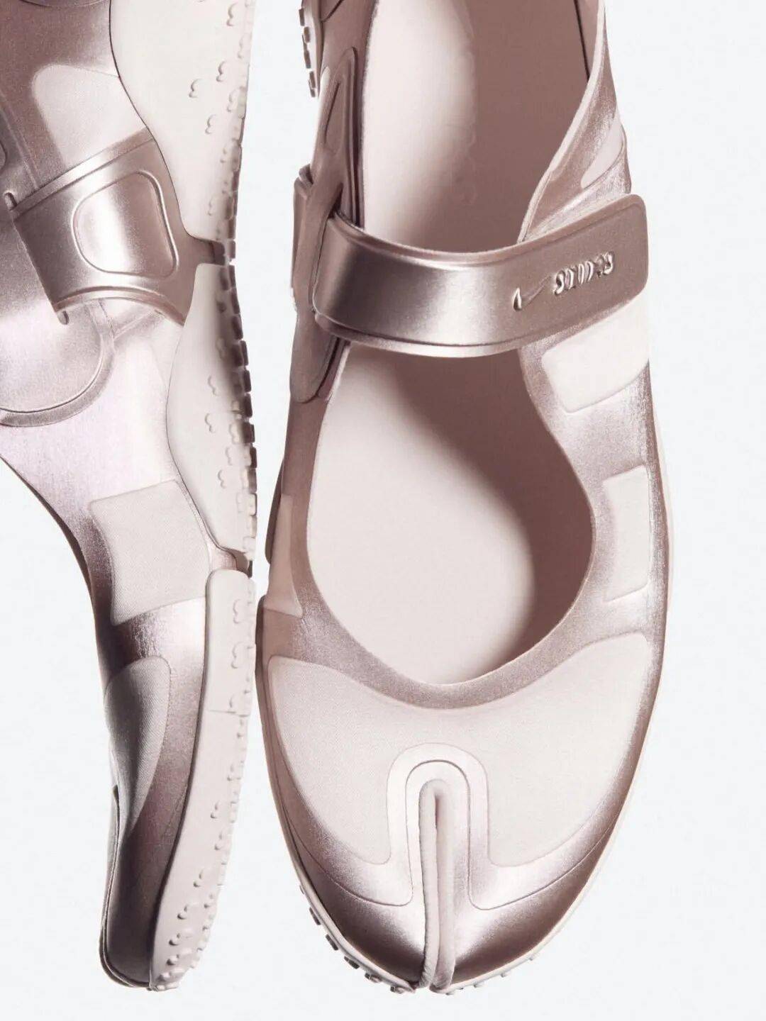 而SKIMS與Nike的聯名鞋款Nike x SKIMS Rift Satin則把運動鞋帶入新的材質語境。經典分趾Rift輪廓配上緞麵質感,讓運動鞋多了一層時裝感,也讓粉色看起來更柔和。