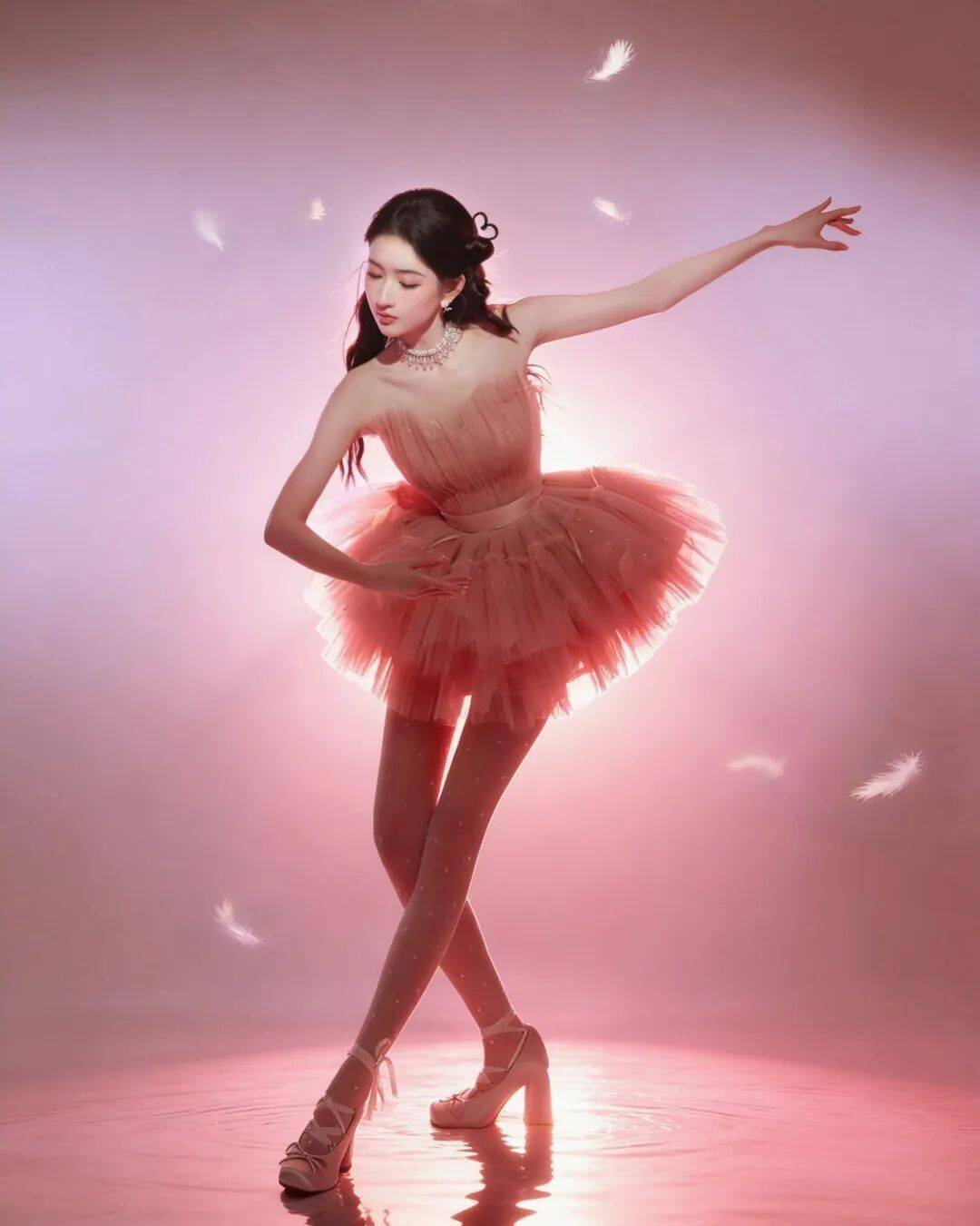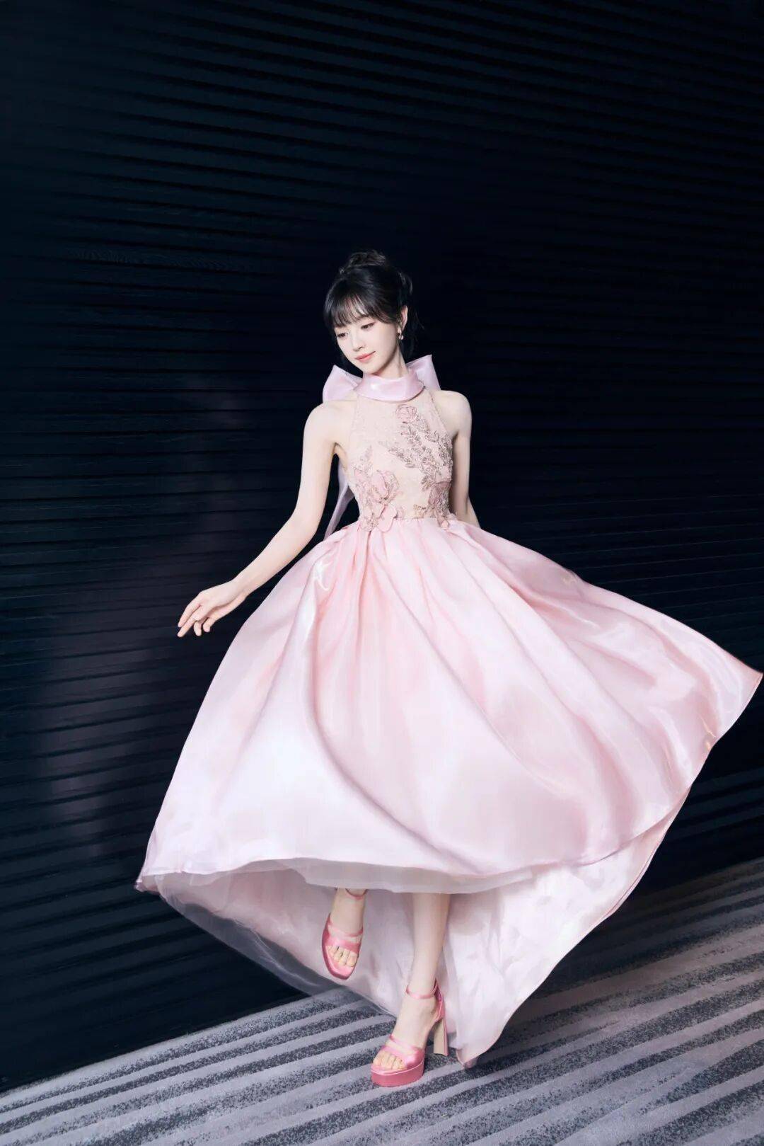 當這種柔和色調遇到芭蕾元素,畫麵自然多了一份輕盈。演員王玉雯身穿粉色紗裙,以層疊薄紗打造出芭蕾舞般的流動感。搭配粉色芭蕾舞鞋,整套造型呈現出柔軟卻不失結構的線條。蘭花粉在這裏更像舞台燈光下的一層柔焦,讓動作與裙擺都帶上春日般的輕快節奏。