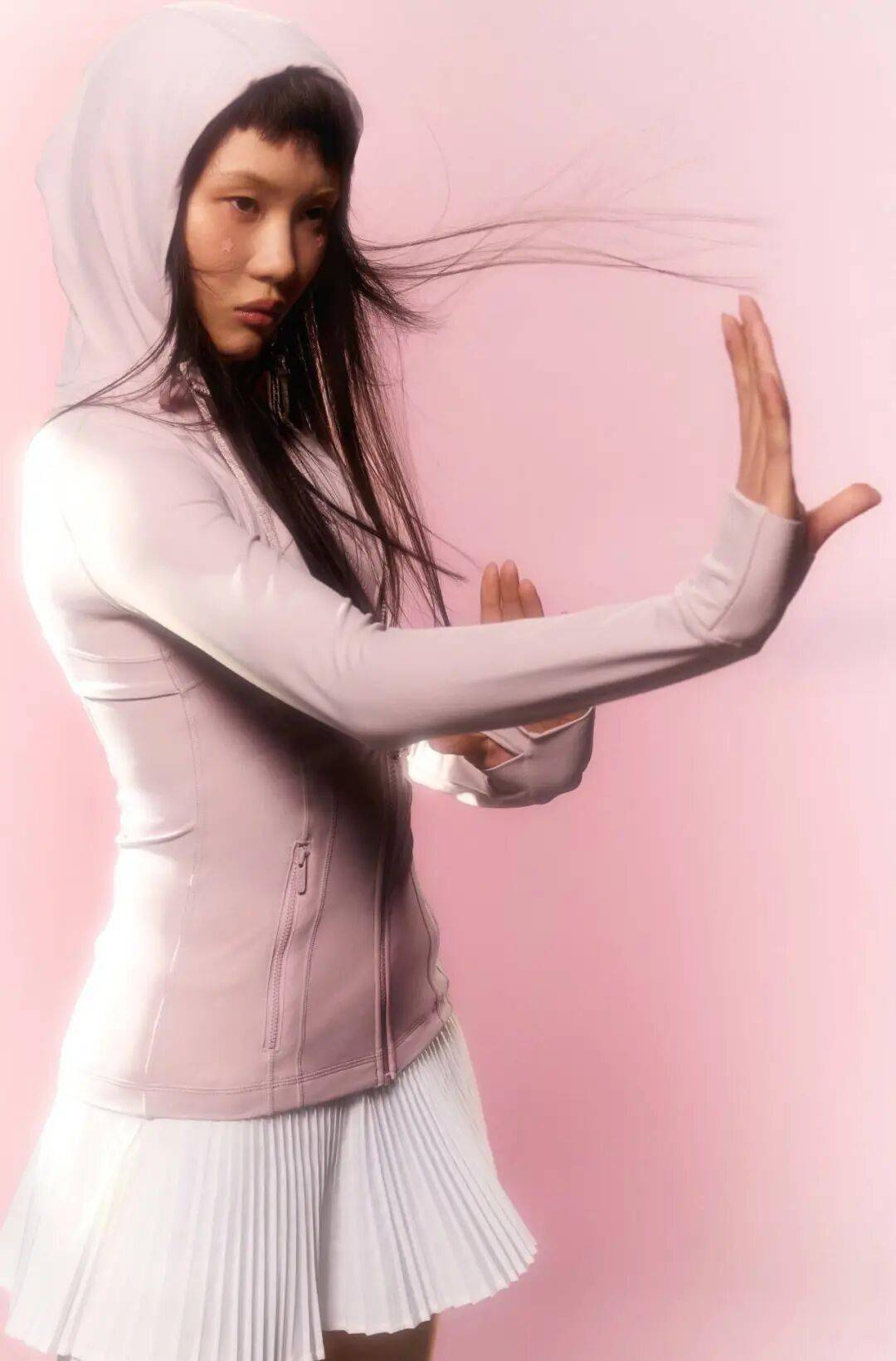 lululemon新一季推出的Define Jacket™係列就把這種柔和色調融入經典運動輪廓。修身夾克延續品牌一貫的利落剪裁,連帽版本則多了一點隨性氣質。搭配輕盈的Varsity風琴褶網球裙,粉白配色清爽自然,在運動感與日常穿搭之間取得平衡。