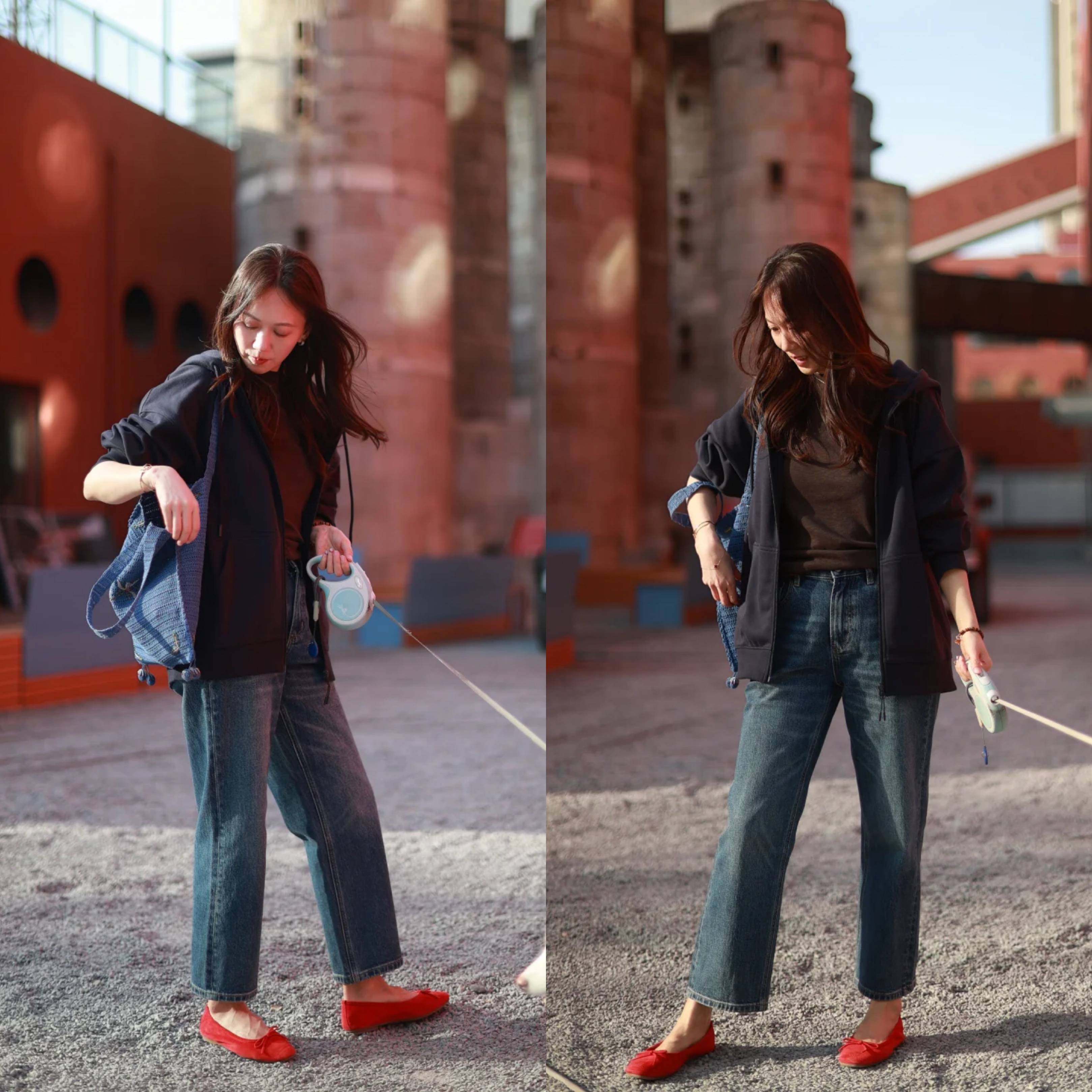 深色與深色結合,會更顯沉穩大氣,深藍色開衫衛衣搭配深咖色打底,沉穩又有層次,牛仔直筒褲修飾腿型,打造隨性休閑感。一雙紅色淺口鞋成為點睛之筆,打破深色係的沉悶,瞬間提升造型亮點。整體舒適自在又不失精致感,休閑中帶著小複古,日常出街慵懶時髦,輕鬆穿出不費力的高級感。