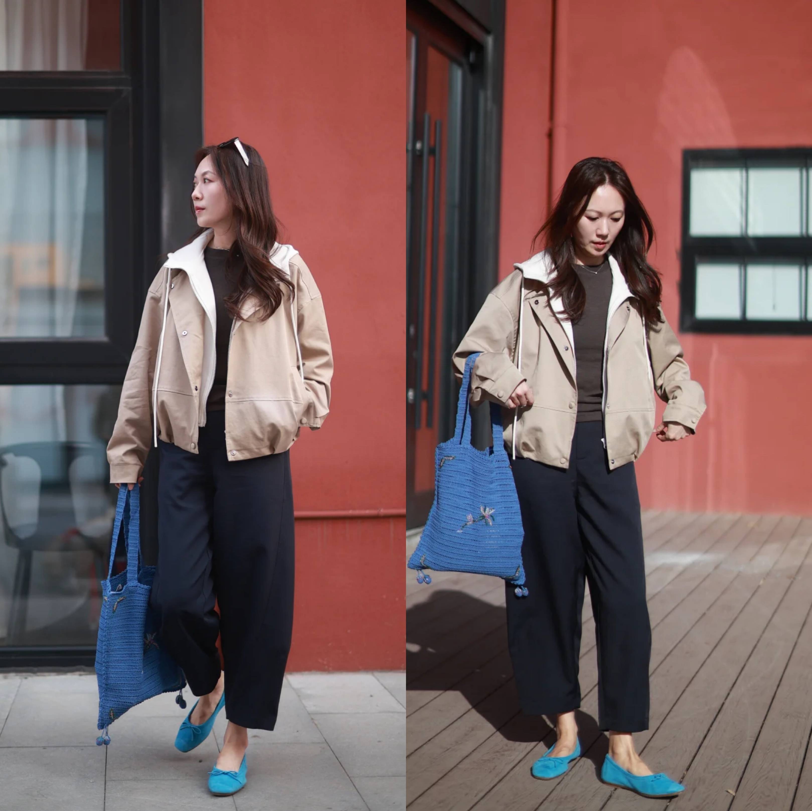 如果說牛仔褲與40+的女性來說是減齡,那麽休閑褲則更適合打造輕熟風,卡其色短夾克內搭深咖色打底衫,下半身銜接黑色九分蘿卜褲,湖藍色淺口單鞋,再拎一直藍色的編織包,整體造型是優雅且休閑舒適的春日輕熟風。