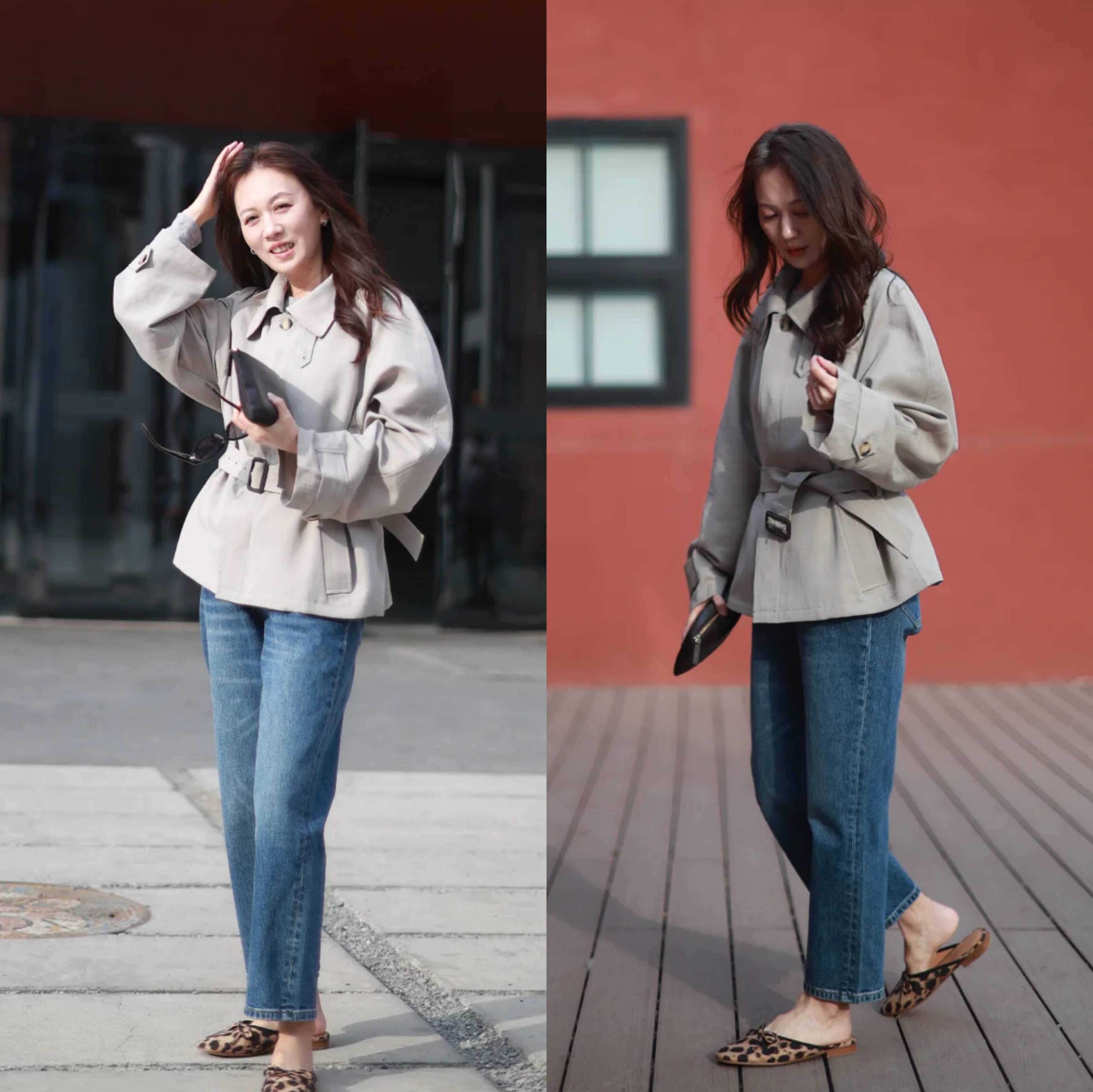 春季穿搭可以讓造型更加利落一點,淺灰色短款風衣外套,采用係腰帶的穿法,勾勒出高腰線位置,下半身搭配牛仔九分直筒褲,豹紋博肯拖鞋加持,可謂是神來之筆,將整體略顯簡約的造型襯托的個性十足。