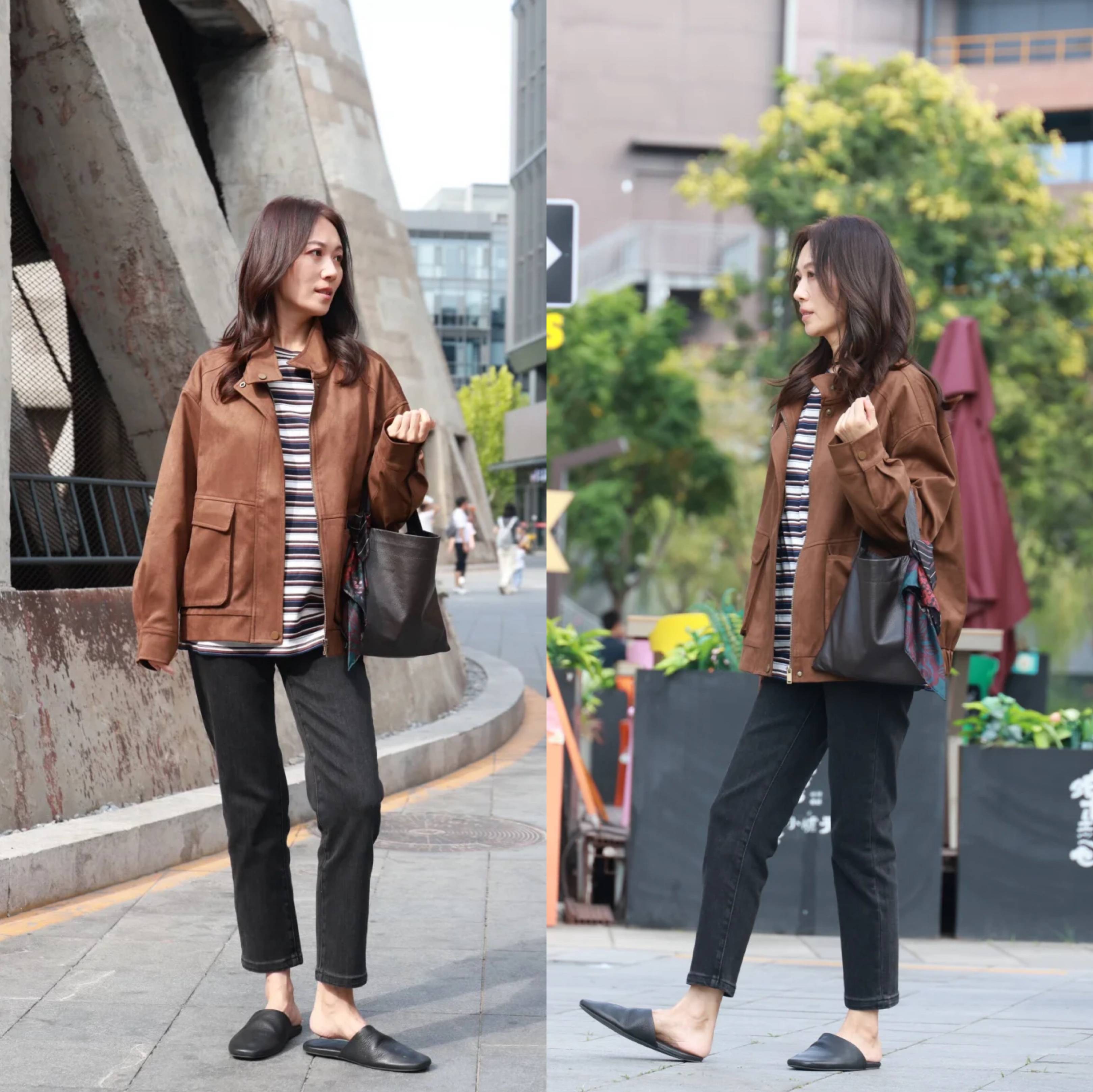 黑色單品總是低調且不易出錯,棕色皮革外套內搭黑白條紋衫打底,上半身可以說是將遮肉做到了極限,那麽下半身的單品選擇就要盡量簡單,比如灰黑色的九分錐形牛仔褲+單鞋,直接將顯瘦效果拉滿。