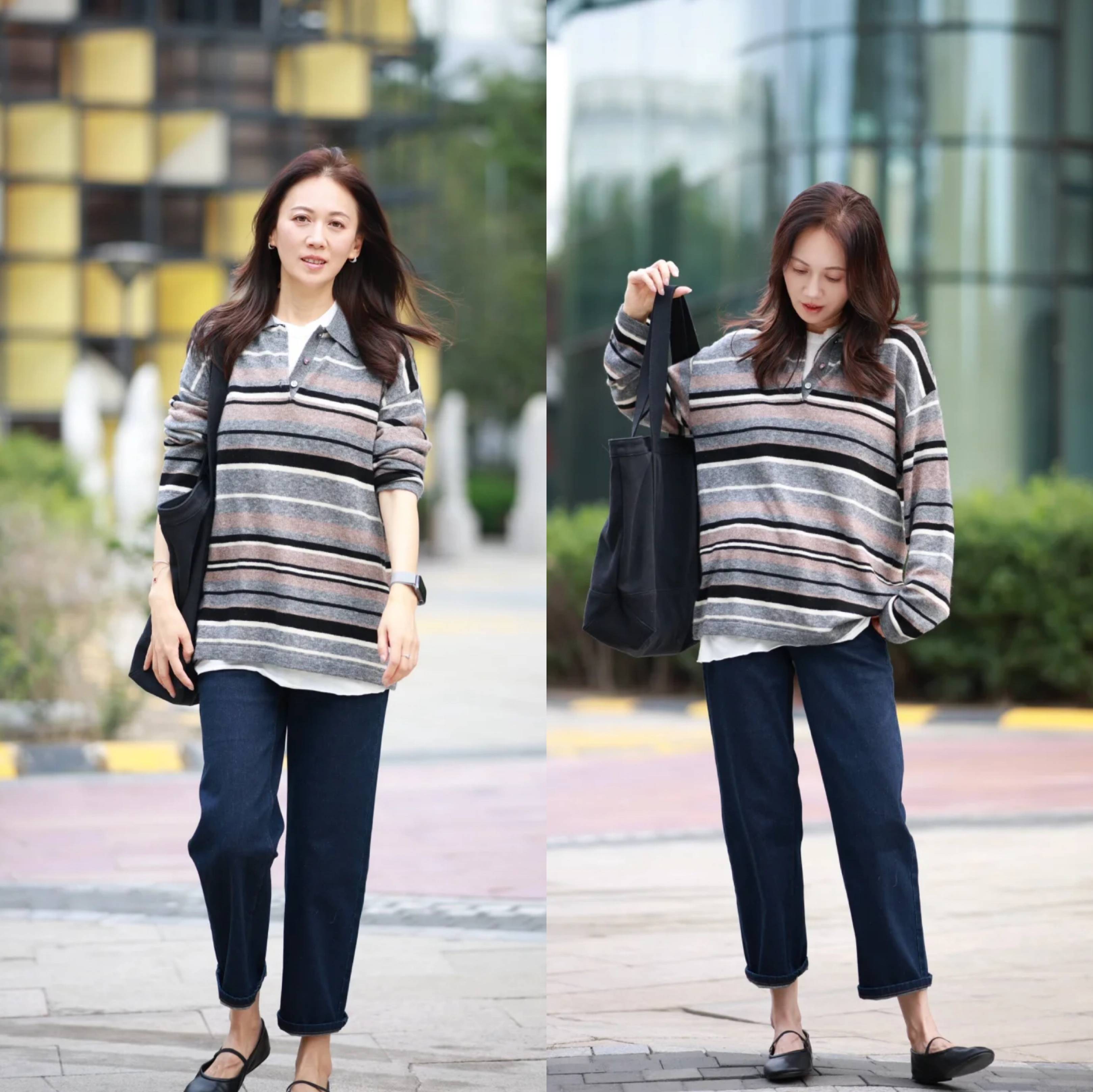 喜歡隨性舒適風格的寶子們,可以嚐試一下寬鬆的條紋針織衫,疊穿白色T恤,一方麵遮肉效果好,可以隱藏身材的不完美,還有很不錯的穿著體驗,下半身銜接深藍色休閑褲+黑色淺口擔心,溫柔又隨性的春日舒適穿搭不過如此了。
