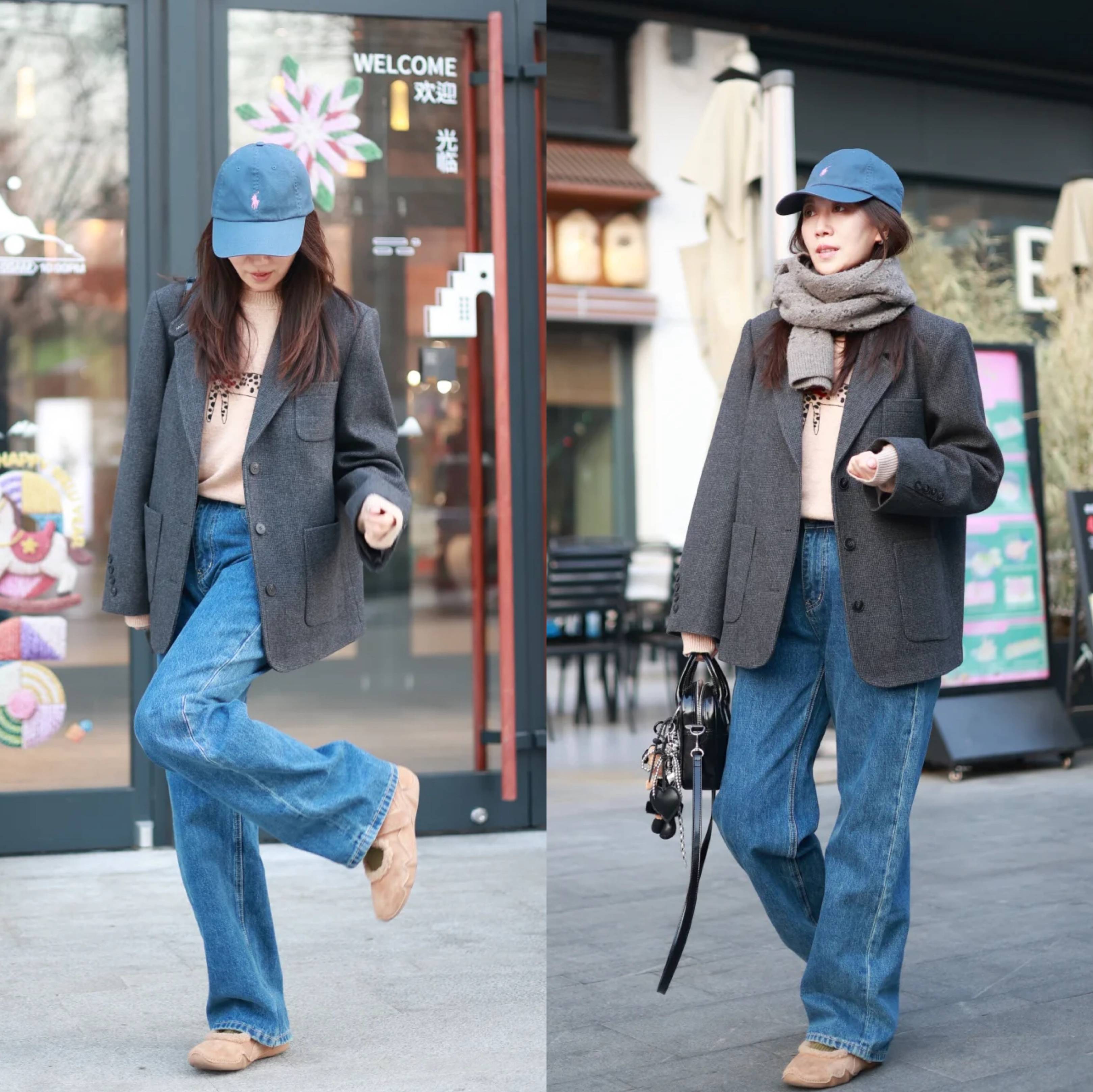 灰色毛呢西裝搭配杏色打底,柔和中和硬朗氣質;藍色直筒牛仔褲消解正式感,隨性又顯瘦;卡其色勃肯鞋增添慵懶氛圍。低飽和色係層次高級,通勤日常皆可,舒適與時髦兼顧,盡顯中年女性的從容優雅。
