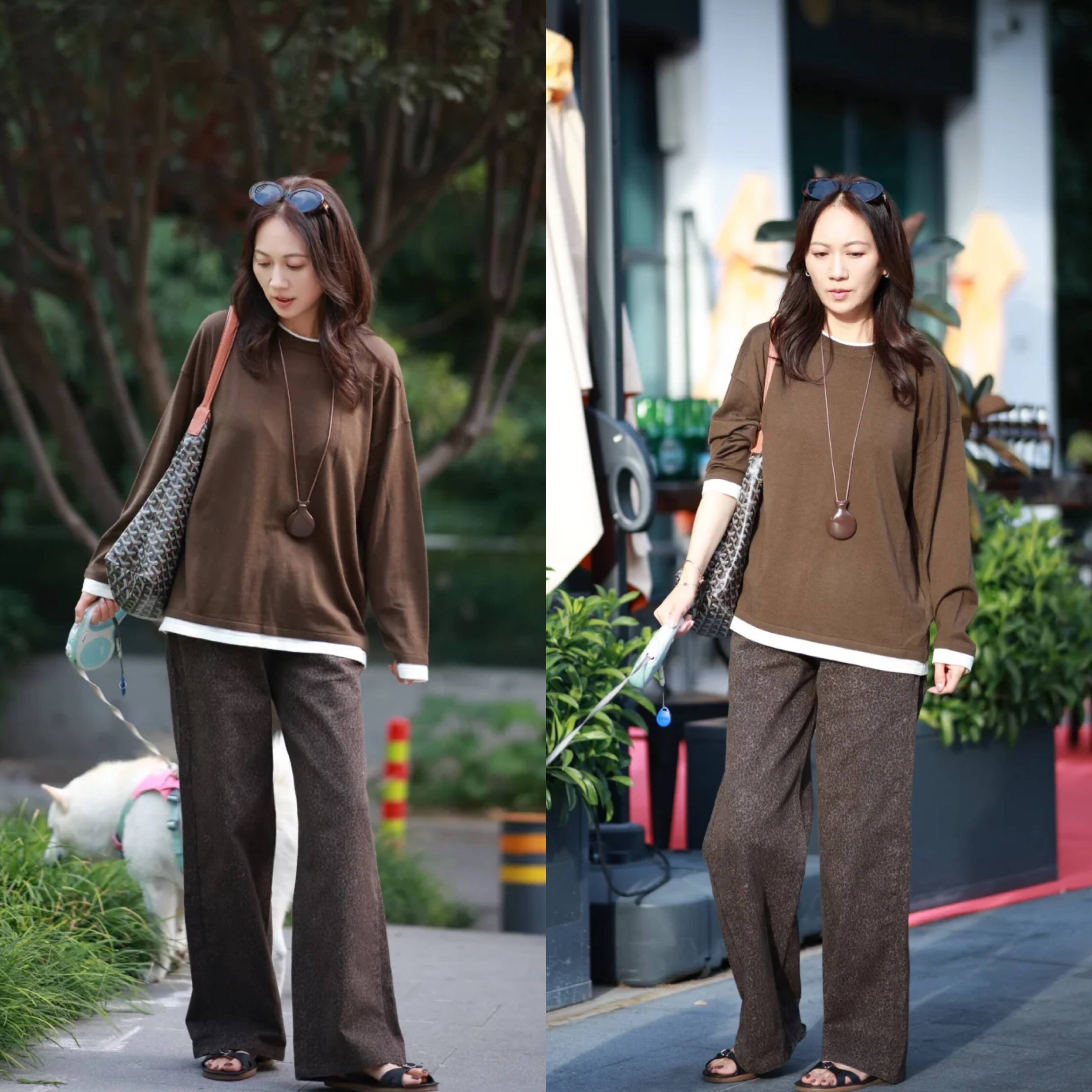 同色係穿搭簡約且高級,還不易出錯,對於大齡女性來說,是非常友好的懶人穿搭模式,咖啡色衛衣疊穿白色T恤,銜接深咖色針織闊腿褲,那種舒適的慵懶感,簡約的高級感,非常顯貴氣的老錢風穿搭其實也很簡單。